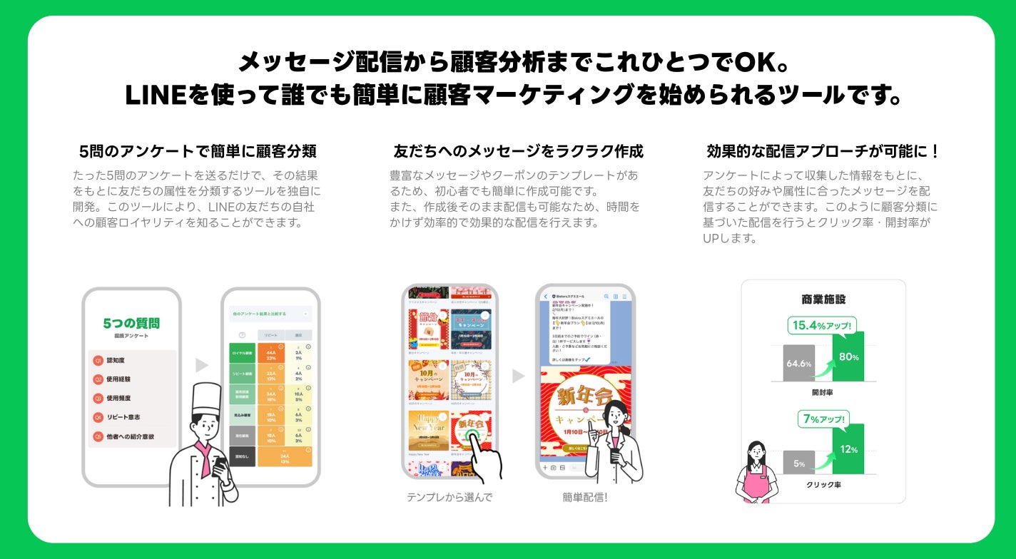 ・主な機能:友だちマップアンケート、カスタムアンケート、クーポン、メッセージ配信、画像テンプレート、事例・Tips集