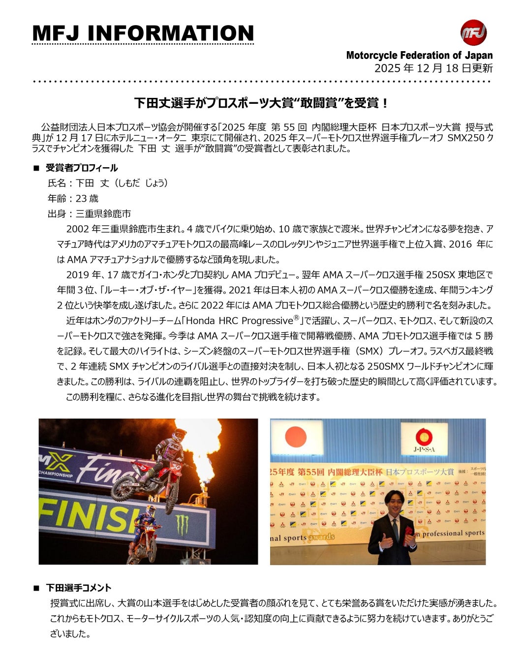 公益財団法人日本プロスポーツ協会が開催する「2025年度 第55回 内閣総理大臣杯 日本プロスポーツ大賞 授与式典」が本日12月17日にホテルニュー・オータニ 東京にて開催され、2025年スーパーモトクロス世界選手権プレーオフ SMX250クラスでチャンピオンを獲得した 下田 丈 選手が“敢闘賞”の受賞者として表彰されました。