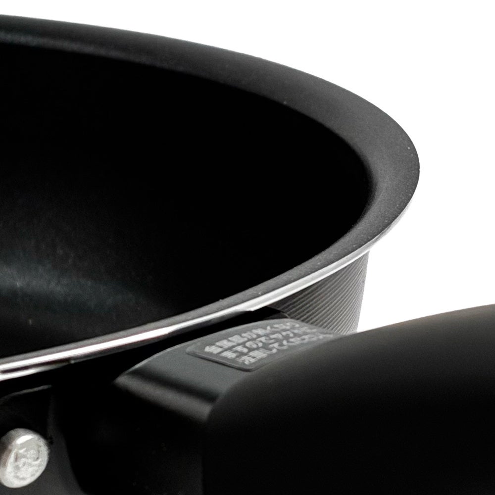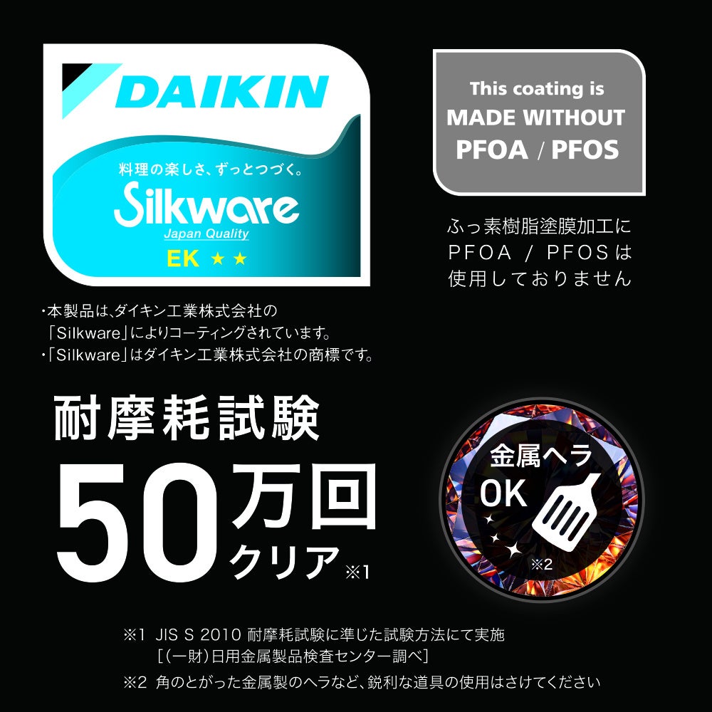 内面は、こびりつきにくく金属ヘラも使える、耐久性に優れたふっ素樹脂塗膜加工。JIS S 2010に準拠した耐摩耗試験で50万回クリアしています。