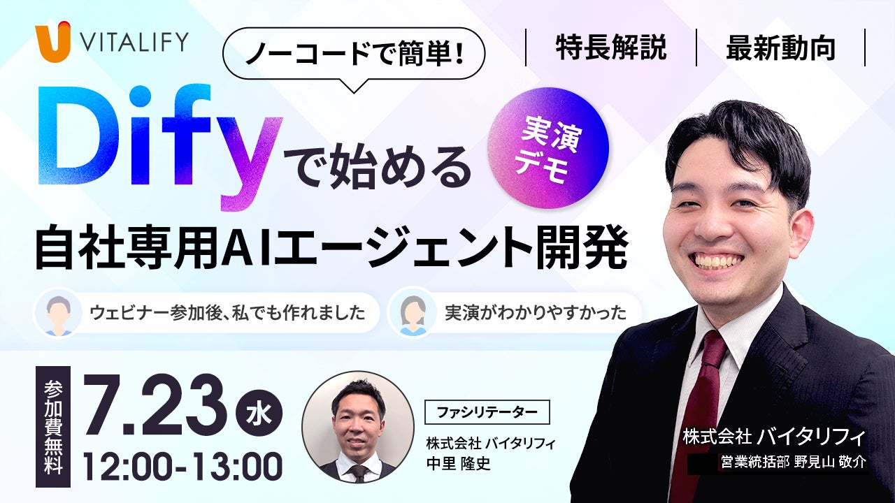 株式会社バイタリフィ、【無料オンラインセミナー】「Difyで始める自社専用AIエージェント開発」を2025年7月23日(水)12:00に開催
