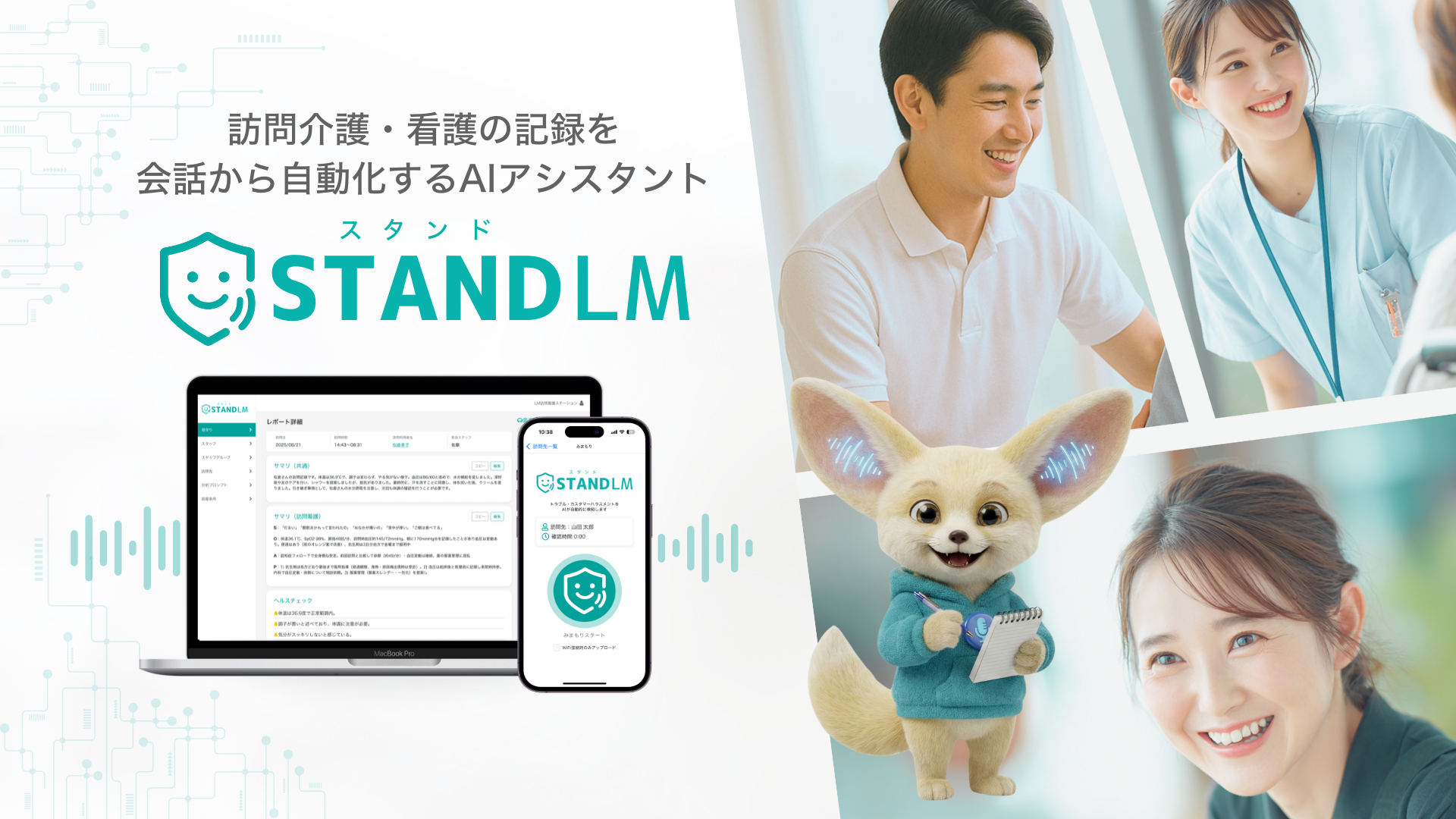 在宅ケアの会話を解析し、訪問記録・ハラスメント検知・スタッフ評価を自動生成する「スタンドLM」。リリースから半年で訪問看護・介護・居宅介護事業所を中心に100社超が導入。累計3.5億の資金調達完了。