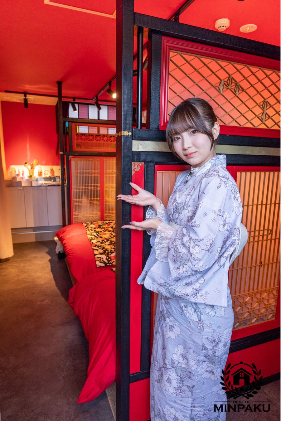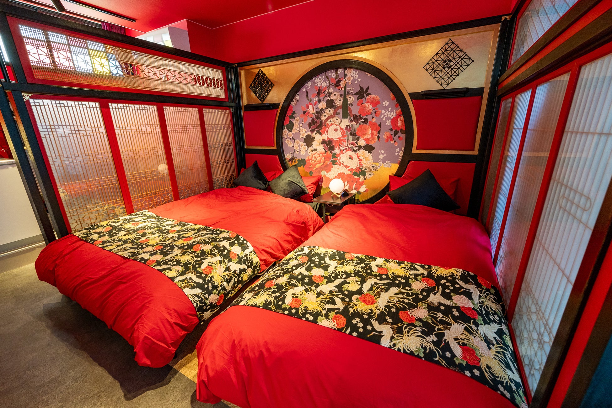 日本独自の文化が栄えた江戸時代の色彩豊かな世界。この赤に染められた宿泊施設は、舞妓や芸者をイメージしたユニークなデザインです。
