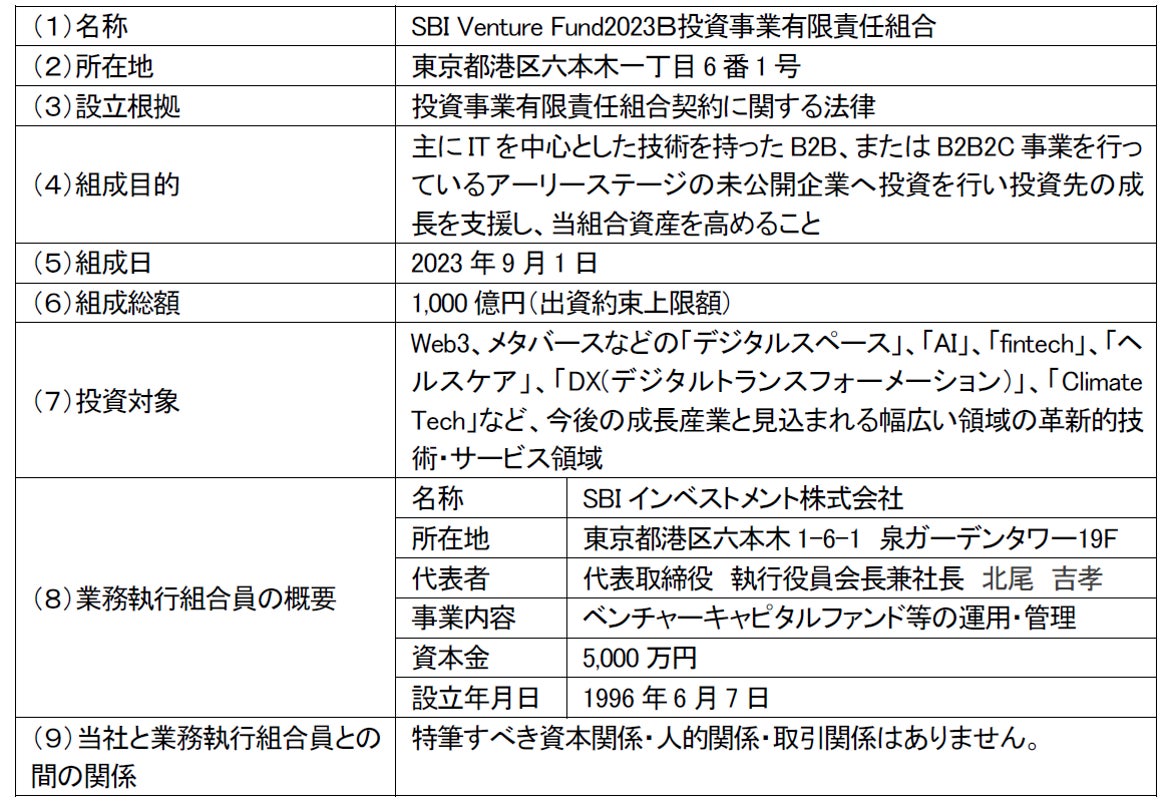 SBIインベストメントは投資先企業に対して、SBIグループのネットワークや経営資源を活用したハンズオン支援を行い、企業価値の向上やオープンイノベーションを促進しています。本ファンドは、SBIインベストメントが設立・運営する国内最大級のベンチャーキャピタルファンドであり、今後の成長産業と見込まれる領域において革新的な技術やサービスを持つ国内外のスタートアップ企業を主な投資対象としています。