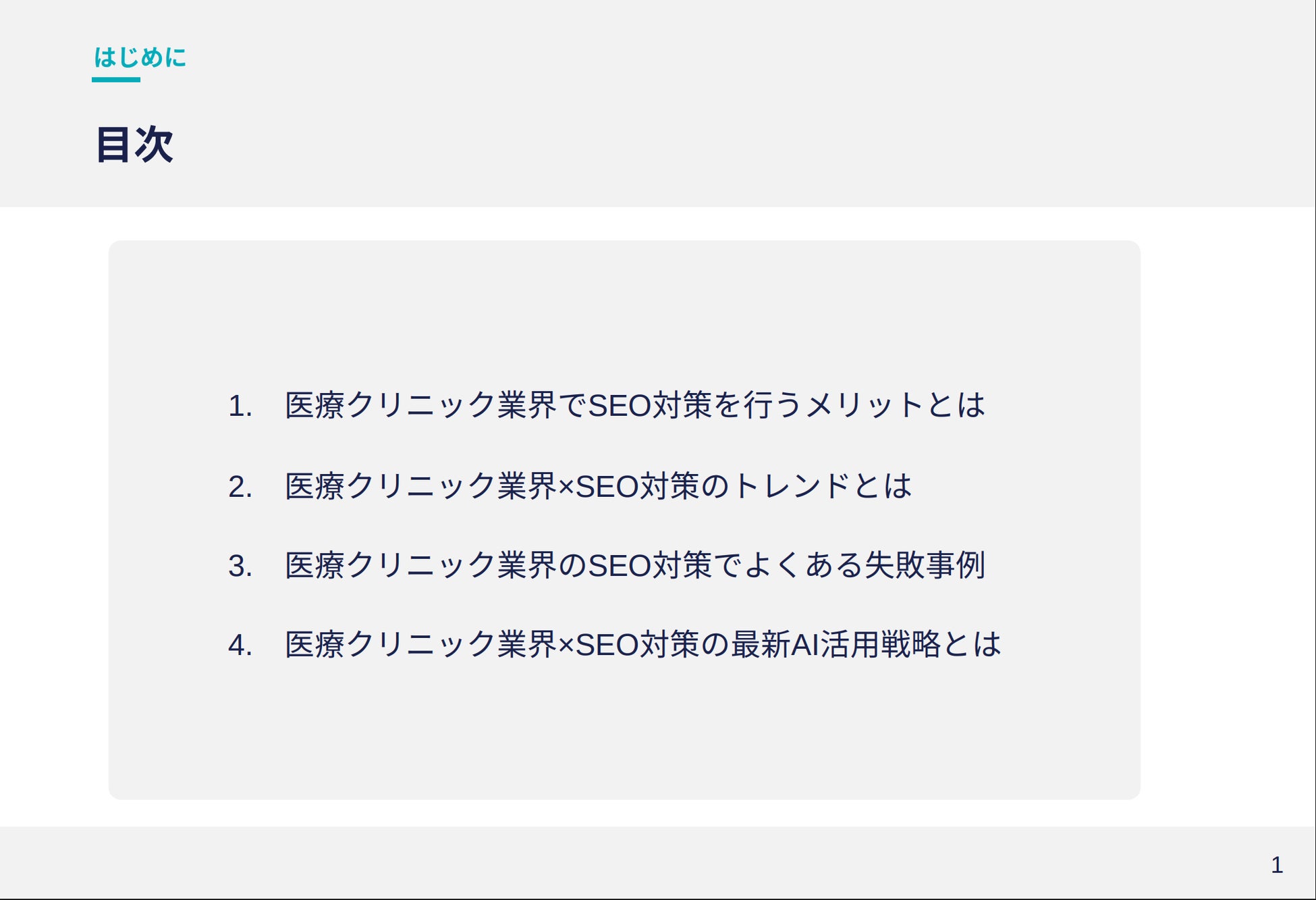 「2025年版 医療クリニック業界向けAI×SEOトレンドレポート」は、当社公式ウェブサイトより無料でご請求いただけます。この資料はAI化が進む現代において、医療クリニック業界でできるSEOでのAI活用法を徹底的に解説しています。