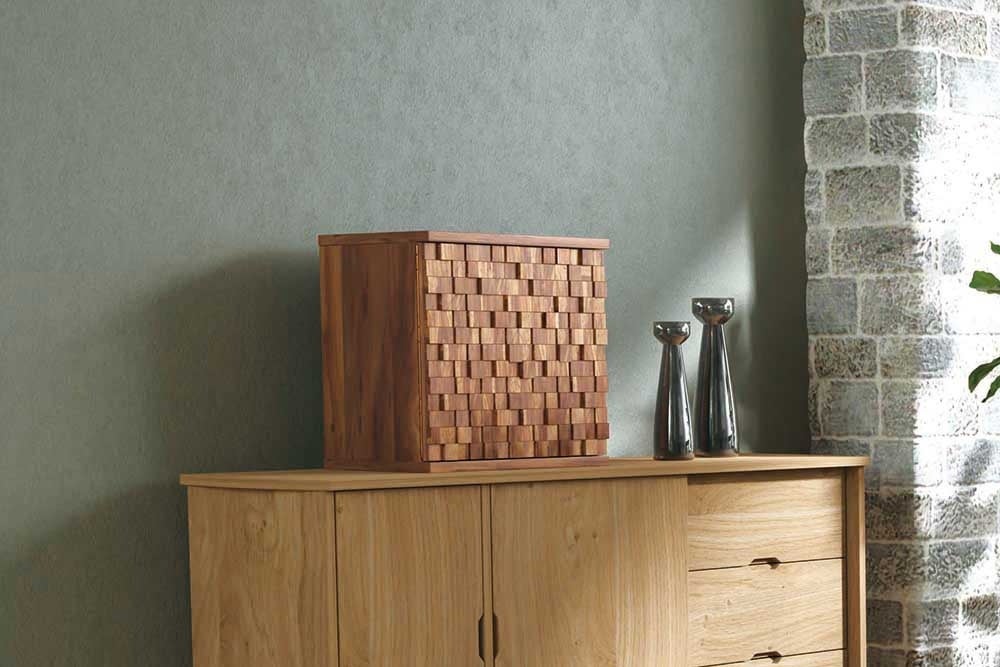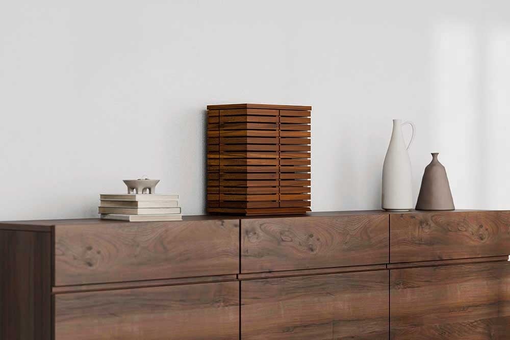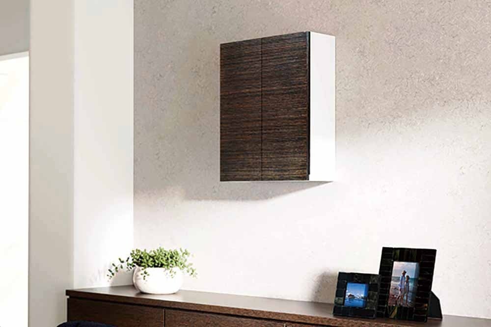 高さを変えたウォールナット無垢材を組み合わせた扉は、ランダムな木目が表情豊かで、開けても閉めてもインテリアのようにおしゃれです。奥行300mm以下の薄型設計なので置き場所に困りません。