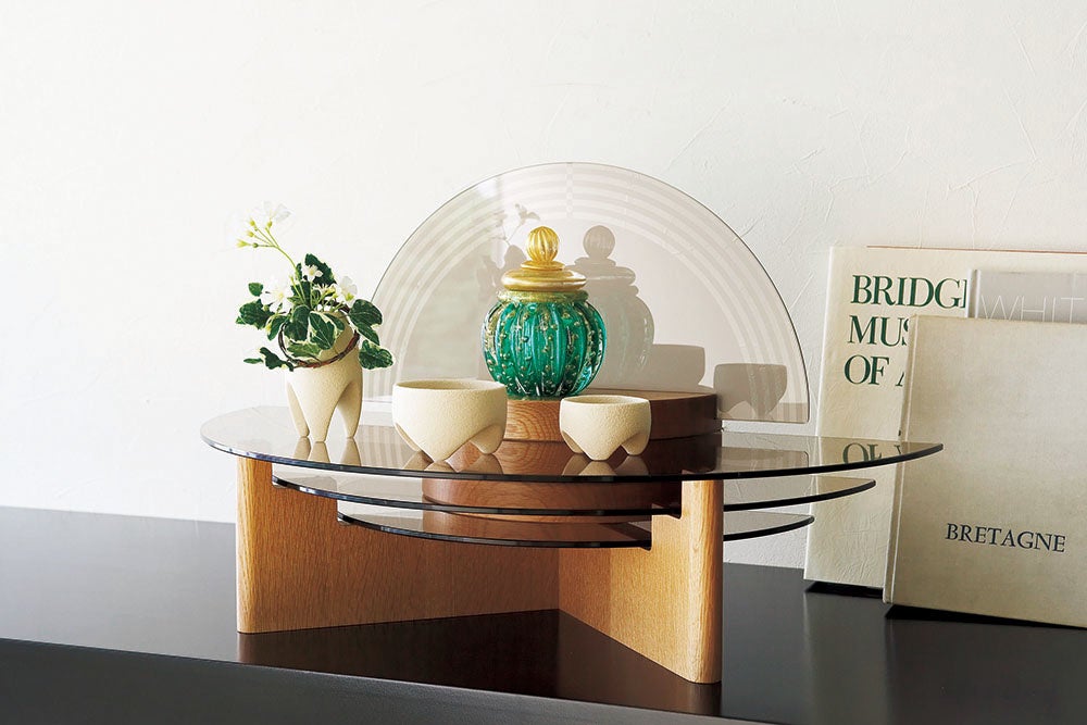 サイズの異なるブロンズガラスを重ねることで生まれるグラデーションと、澄んだ透明感がモダンな美しさを強調。脚元に「ナラ材」を使用し、木材の温かみを加えることで、お部屋の雰囲気を問わず合わせていただけるデザインになっています。