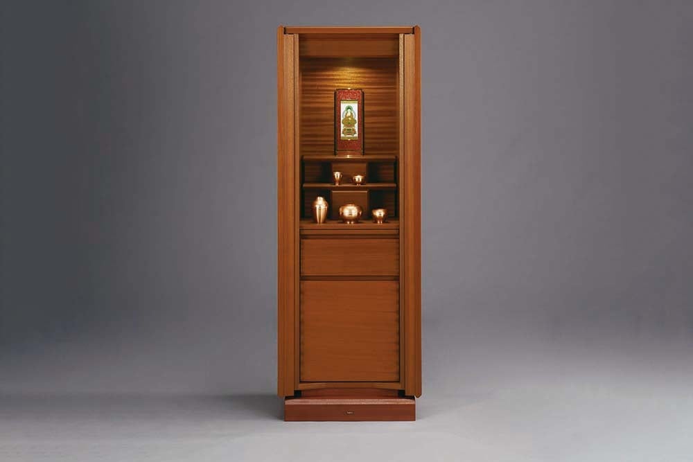 格子が似合う古都・京都の落ち着いた雰囲気をイメージして作られた「渡月」。なんと厚みは2位でご紹介したライフをしのぐ150mmでありながらも、内部に折りたたまれた須弥壇を出すことで、仏具を置いてしっかりとお参りしていただけます。