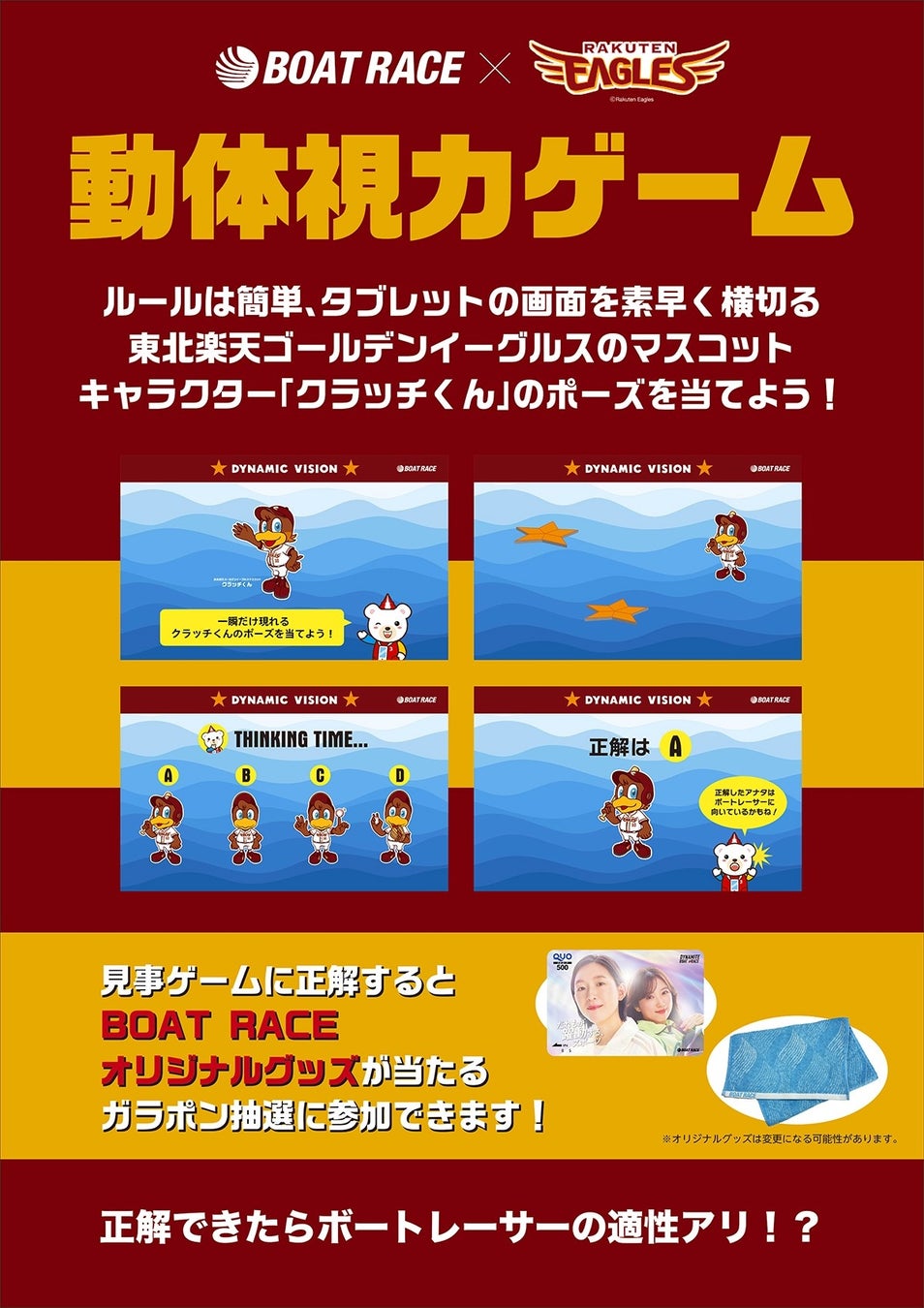 画面を素早く横切る楽天イーグルスのマスコット「クラッチ」のポーズを正答すると、ボートレースオリジナルグッズが当たる抽選会に参加ができます!