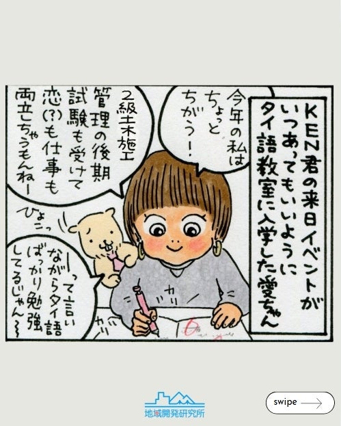 愛ちゃんは、施工管理の受検を決意した同じタイミングで、タイ俳優のKENくんを好きになりました。彼に会う日を夢見てタイ語の勉強を始めたいと思い、ビーバー先生の助言をもらいながら、試験勉強と趣味の勉強を両立させることにしました。