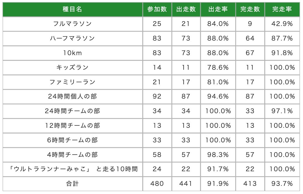 フルマラソン、ハーフマラソン、10㎞、「ウルトラランナーみゃこ」と走る10時間、ファミリーラン(1.3km)、キッズラン(1.3km)