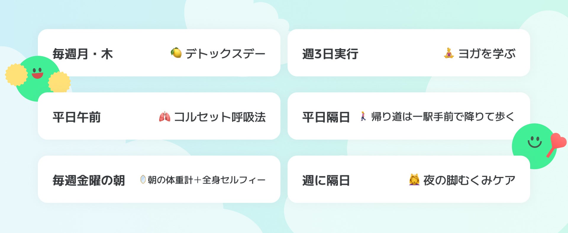例えばダイエットを目指すユーザーは「月水金に有酸素運動」を設定して無理なく体力管理を行い、オフィスワーカーは「平日の午前中だけ胸を開くストレッチ」を取り入れて座り姿勢によるコリを和らげることができます。また「平日の夜だけ軽い食事」を入れるだけでも、翌朝の爽快感が変わってきます。