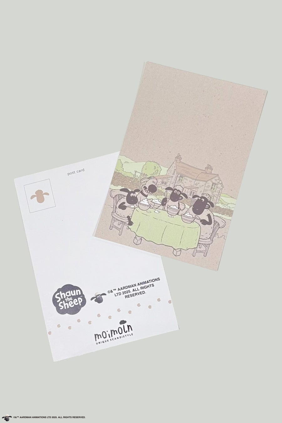コラボレーションの発売を記念し、モイモルン各店舗へのご来店、また公式オンラインストアにてコラボ商品をお買い上げいただいた方に、先着で「ひつじのショーン X moimoln オリジナルポストカード」をご用意しております。裏面はメッセージカードとしても使える仕様で、ポスト投函も可能です。