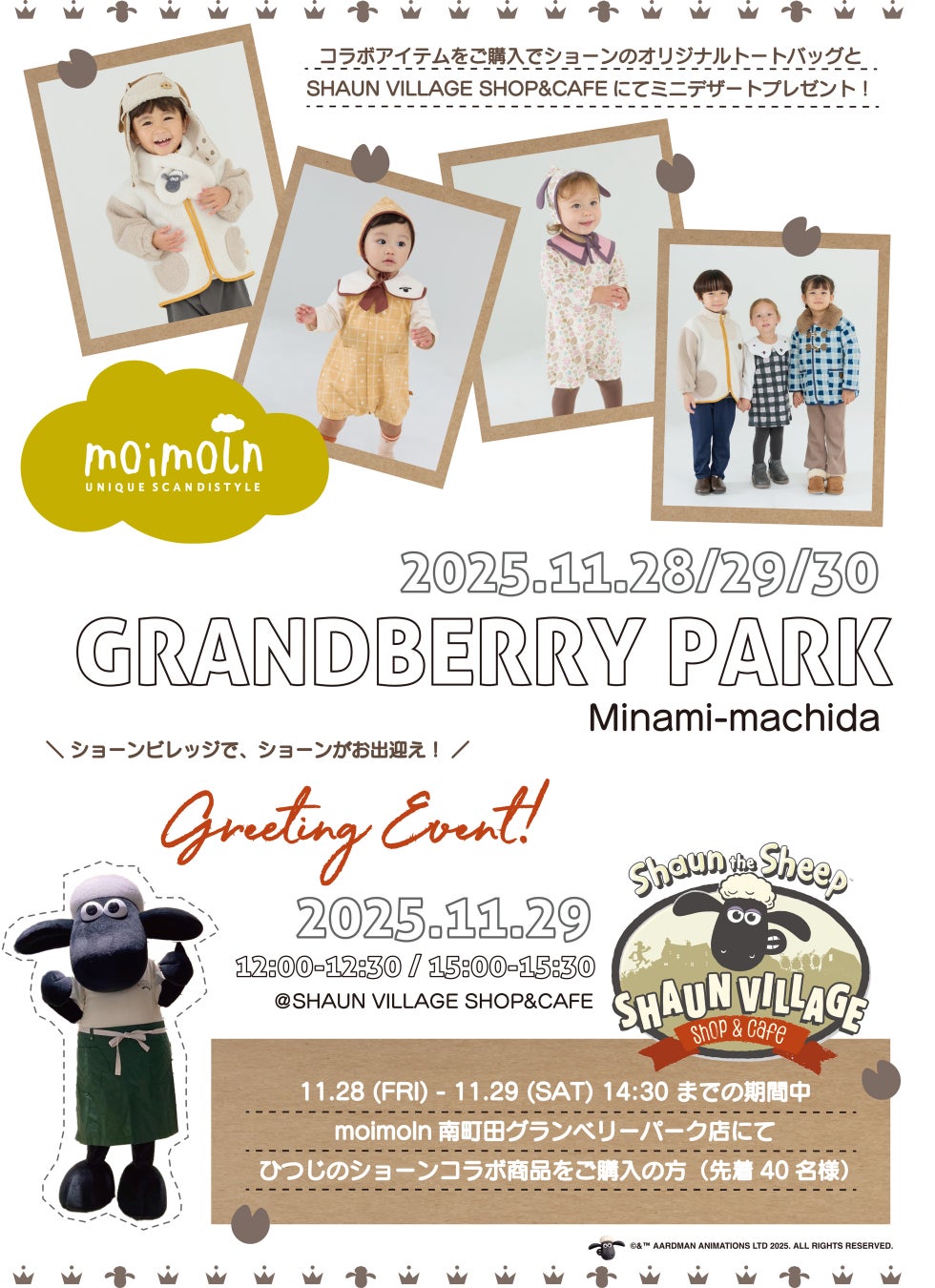 ■内容:南町田グランベリーパーク店にて「ひつじのショーン X moimoln 」コラボ商品をご購入の方へ、先着でグリーティング参加券を配布いたします。