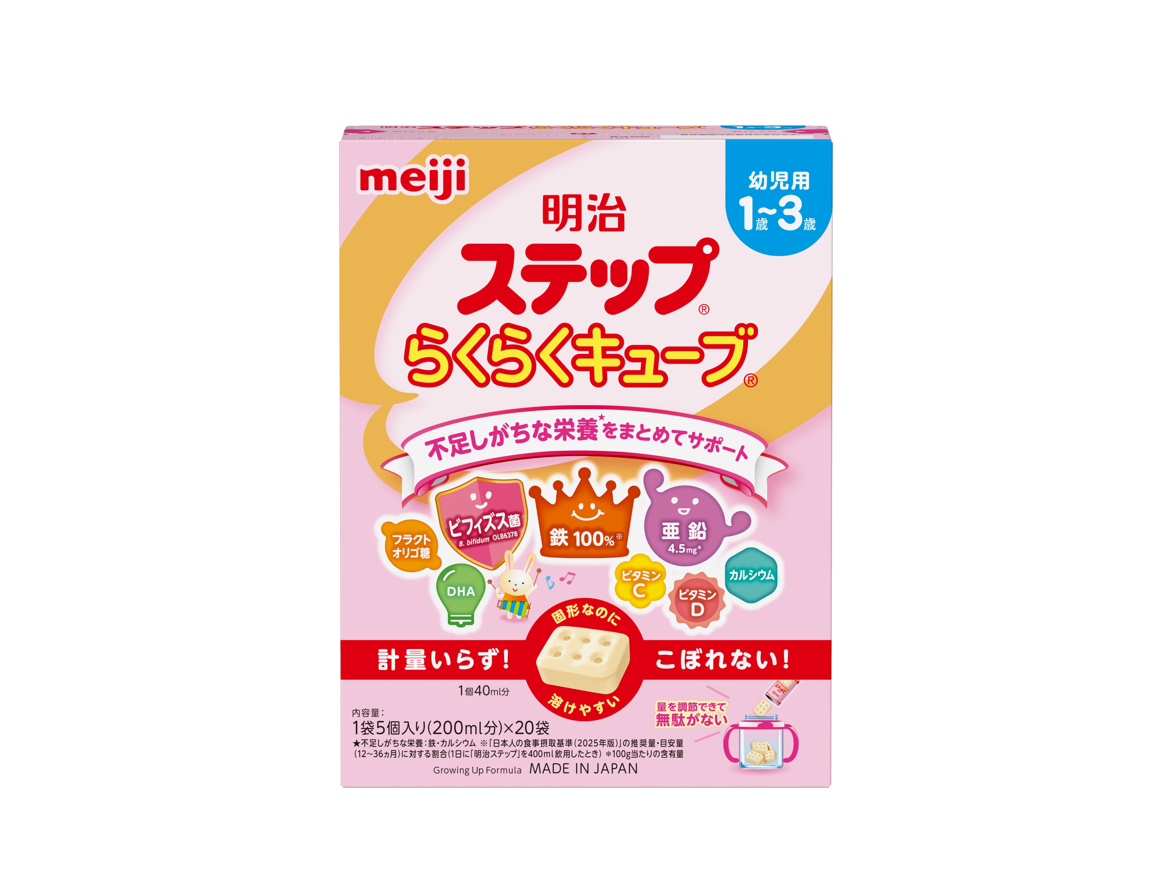 「明治ステップ らくらくキューブ」は、簡単に調乳ができるキューブタイプで、お料理にもおすすめです。新たにビフィズス菌と亜鉛を配合し、お子さまの確かな成長を栄養面でサポートします。