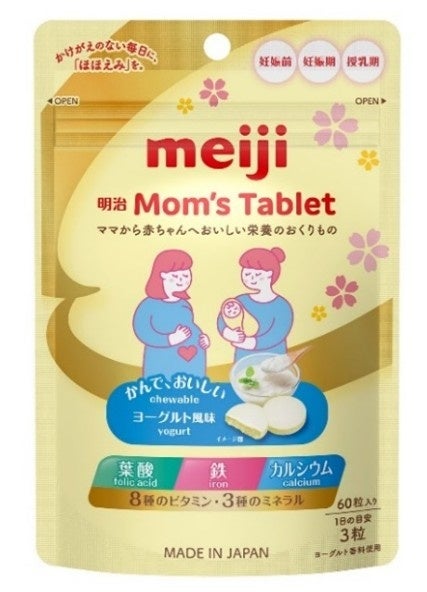 「明治Mom's Tablet」は(2026年3月9日発売予定)ママに特に必要な葉酸、鉄、カルシウムを含む、厳選した8種のビタミン※5と3種のミネラル※6を配合したチュアブルタイプのタブレットです。ヨーグルト風味でおいしく、1日3粒と手軽に、通常の食事だけでは不足しがちな栄養を