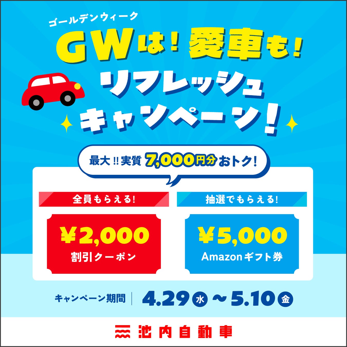 【2026年4月29日開始】格安板金の池内自動車、GW期間中に最大7,000円相当を還元する『GW愛車リフレッシュキャンペーン』を全店一斉開催!
