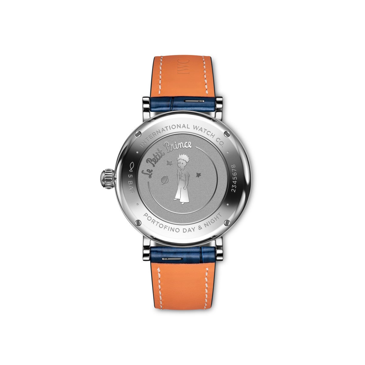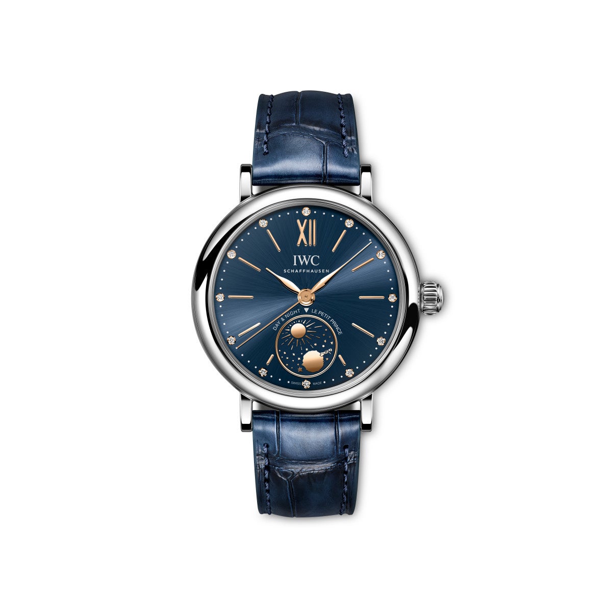 「ポートフィノ・オートマティック デイ&ナイト 34 “プティ・プランス”」(Ref. IW459806)は 、耐 久 性 に優 れ たステンレススティール製のコンパクトな34 mmのケースを備えています。エレガントでタイムレスなドレスウォッチのデザインは 、ゴールドメッキの針とアプライド・インデックスが配されたディープブルーの文字盤によって引き立てられています。精巧なサンレイ仕上げが施された文字盤が、サン=テグジュペリの不朽の名作を称えるIWC特別モデルのデザインのポイントです。