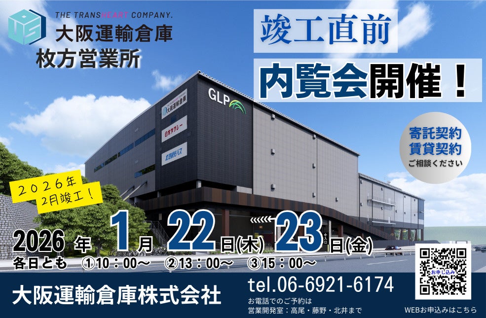 大阪運輸倉庫「枚方新倉庫」竣工直前の第2回内覧会を開催決定(1月22日、23日)