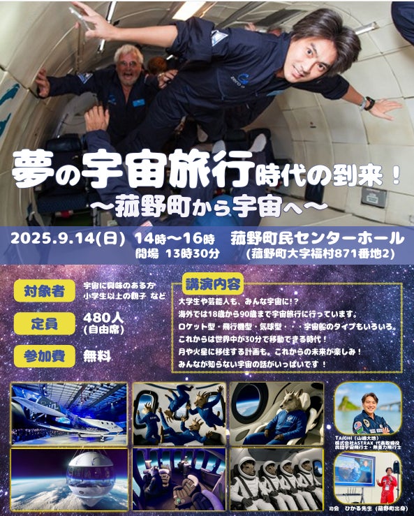 2025年9月14日(日)、菰野町町民センターホールにて株式会社ASTRAX代表取締役で民間宇宙飛行士のTAICHI氏による特別講演を開催します。