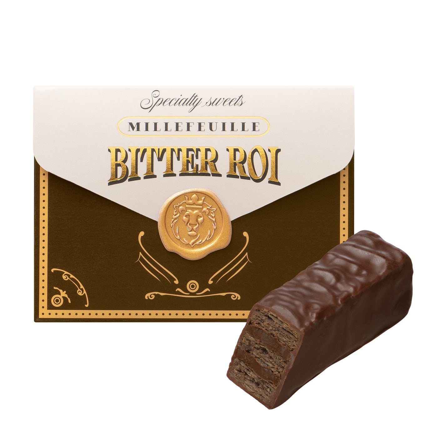 隠し味に加えたカカオクリームをサンドし、ビターチョコレートでコーティングした、