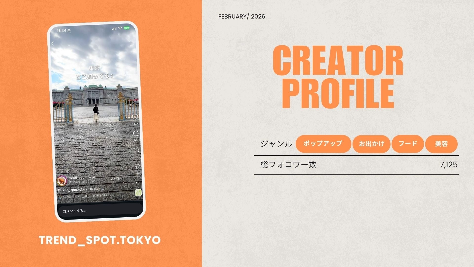 「trend_spot.tokyo」は、都内を中心に観光地や飲食店などを取材し、動画の制作・発信を行っています。これまでの投稿の中には、再生回数72万回を超える動画もあり、高い発信力を有しています。企業・ブランドが実施するポップアップイベントや、週末のお出かけスポットの認知拡大および来場促進が期待できます。