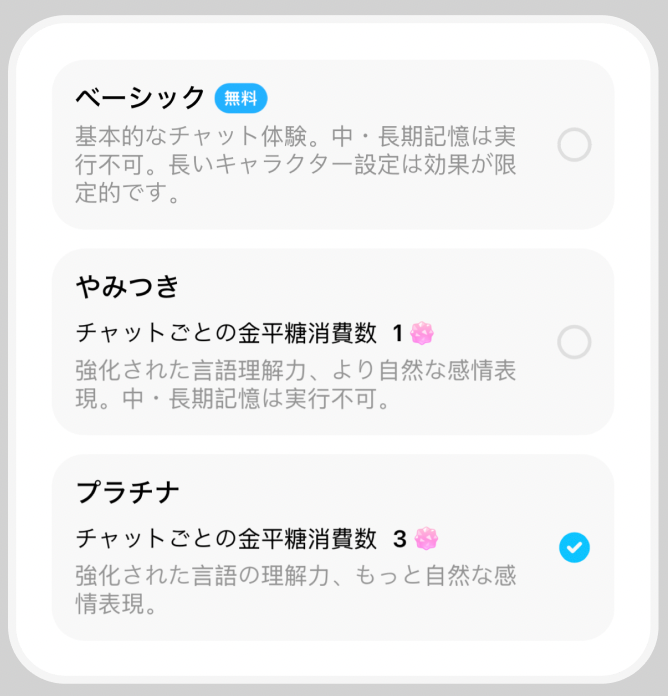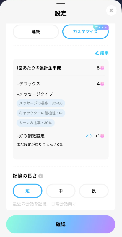 基本:簡潔で短い返答を中心とした日常会話に最適なスタイル。長文:動作や情景描写を含んだ、より豊かな表現を伴う返答。物語:長編小説のように展開される物語形式。複数キャラクターとのロールプレイにも適合。選択肢:複数の選択肢を提示し、ユーザーの選択に応じて会話が分岐する形式。連続:一度に複数メッセージを返し、臨場感ある自然な会話を実現。