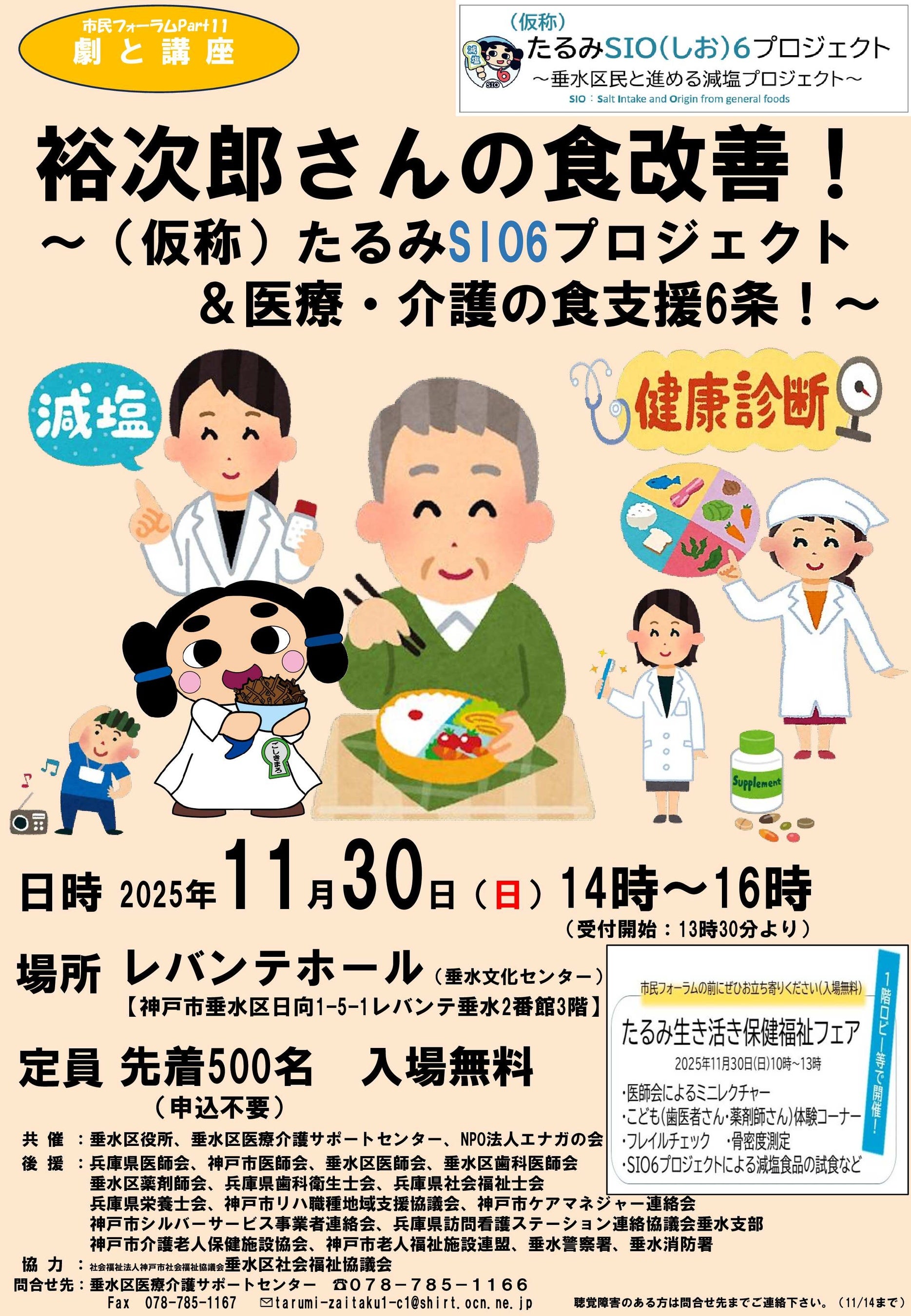 2025年11月30日(日)、神戸学院大学栄養学部および薬学部の学生と、薬学部の白川晶一教授が、神戸市垂水区のレバンテホールにて上演する演劇「裕次郎さんの食改善!」に出演します。