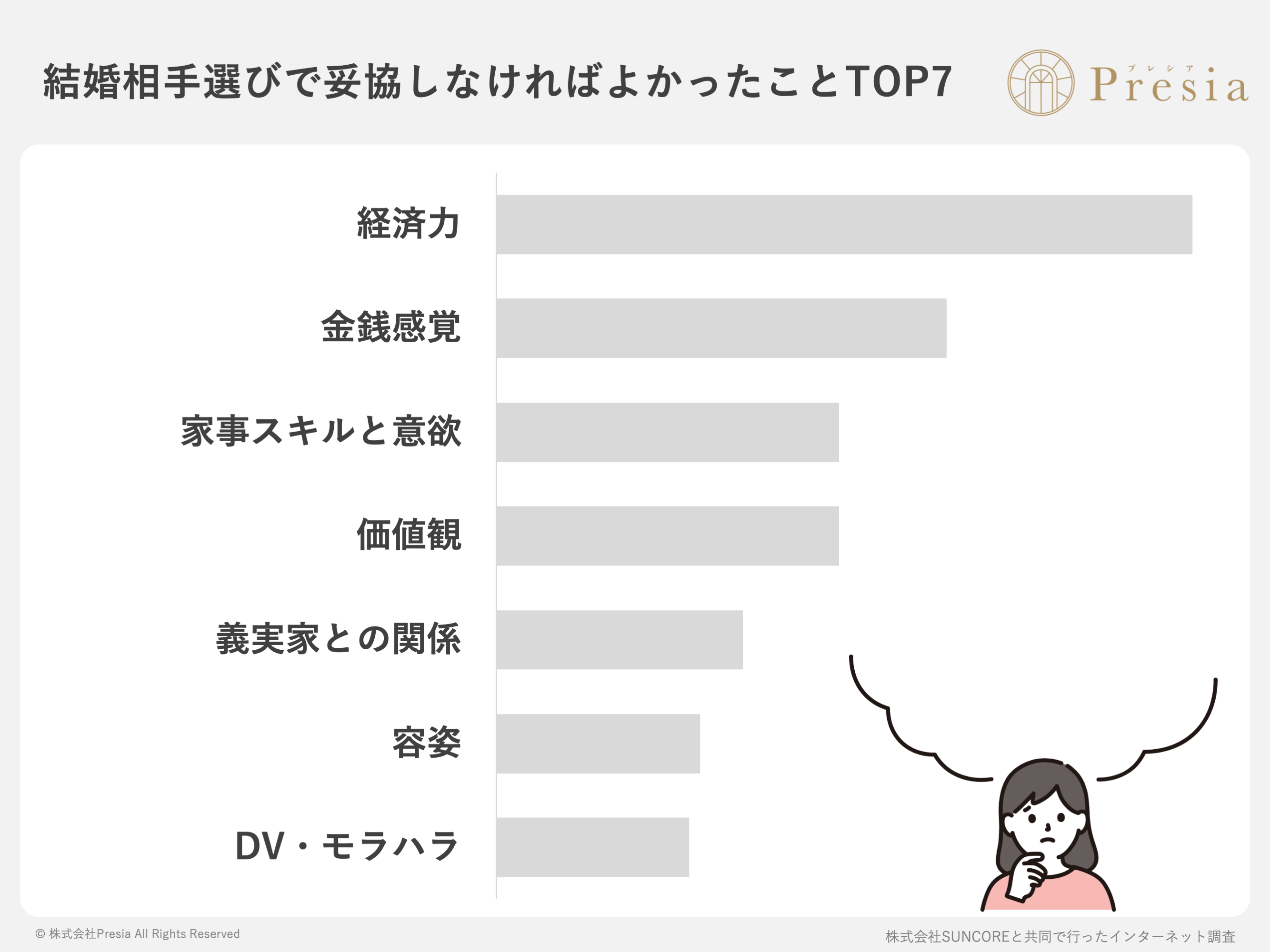 7割が「夫選びに後悔あり」。妥協してはいけないのは「経済力」、してもいいのは「容姿」。結婚相談所Presiaが調査レポートを公開