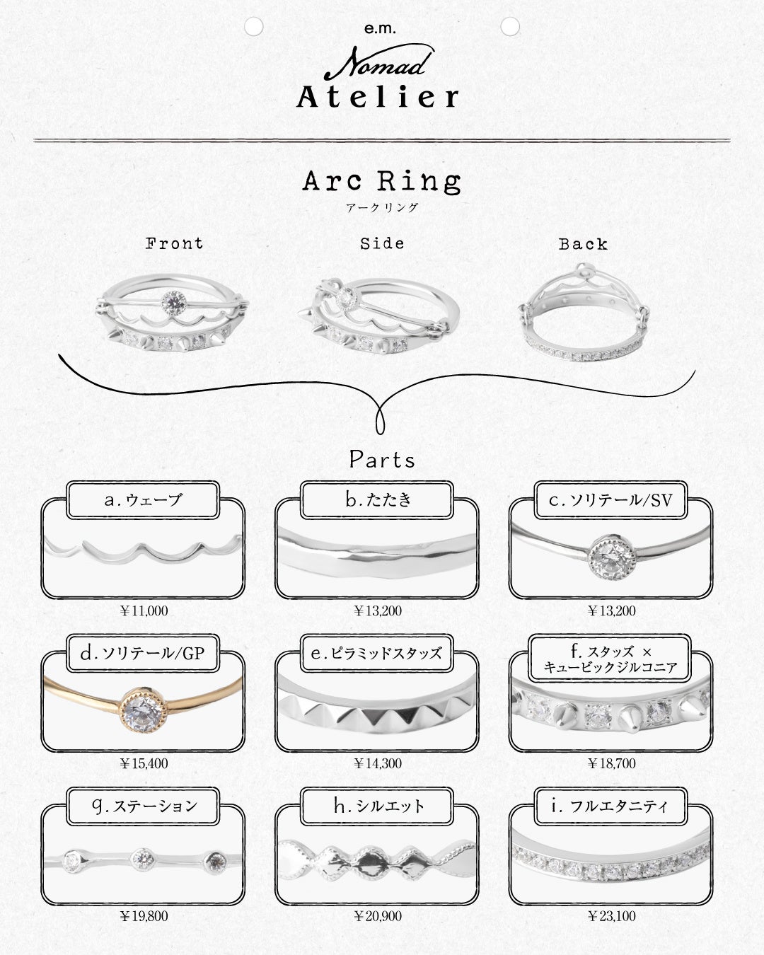 9パターンのリングパーツから3種類もしくは4種類をセレクトし、重なり方で表情を変えるリングをお作りします。