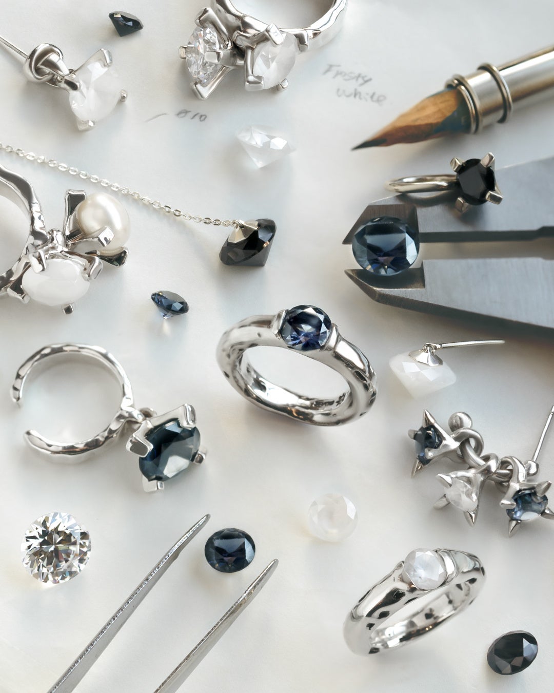 鉛筆デッサンで描き出したような、奥行きを感じるモノトーンカラーのジュエリー。