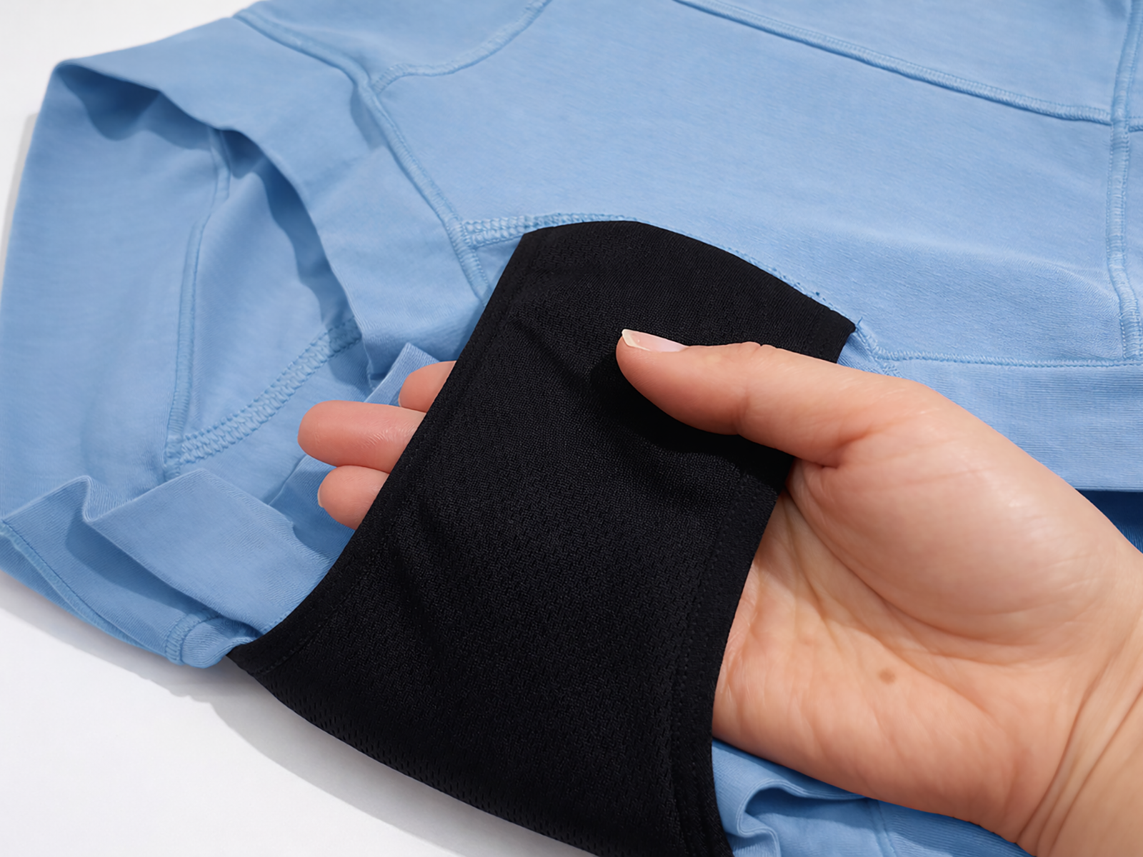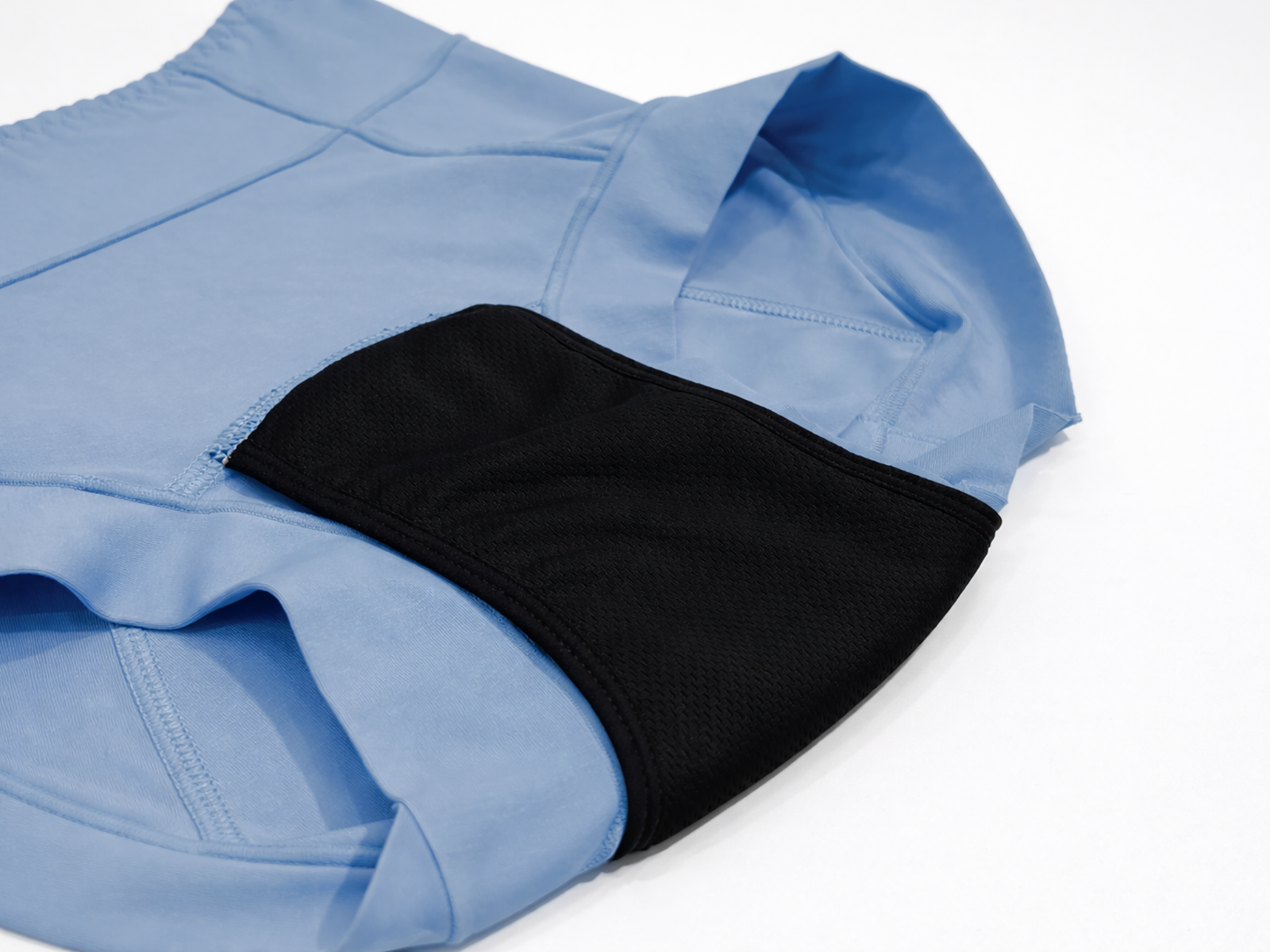 単に履き心地が良いだけでなく、少しでも快適に過ごせるよう機能面にもこだわりました。私自身も含め、ナプキンと吸水ショーツを重ねて使う方が多いため、ナプキンの羽が隠せる二重構造にしています。