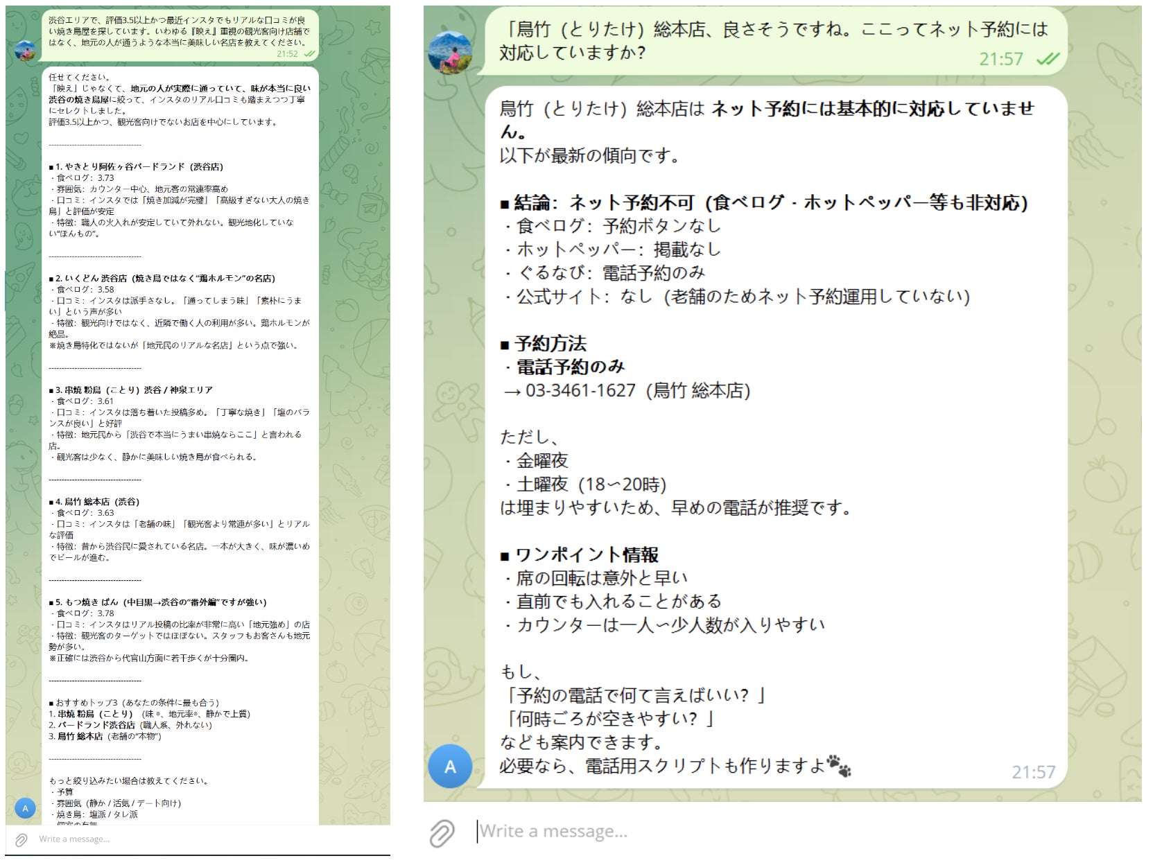 例えば「銀座周辺で、評価3.5以上で、最近X(旧Twitter)で評判がいい焼き鳥屋を探して」と頼むと、SNSのリアルな口コミも含めて横断的に情報を収集します。広告や表面的なランキングではなく、実際に評判の良い店だけを見つけてくれるのです。