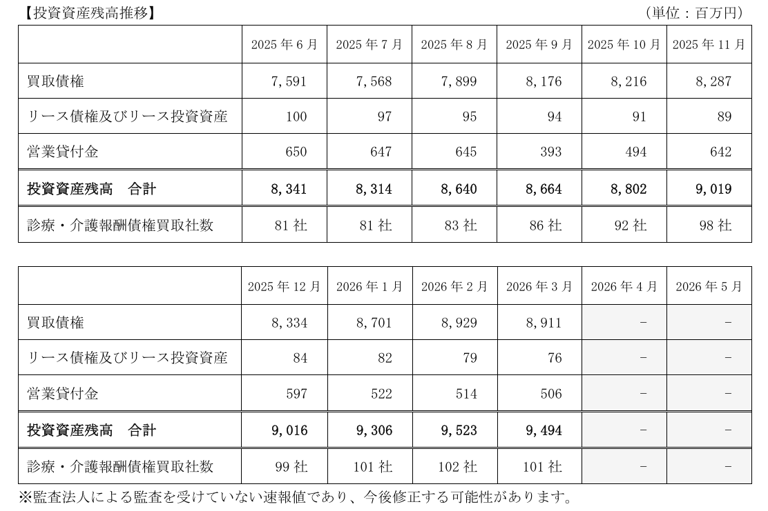 2026年3月は、債権買取社数が1社解約で減少し、3月末で101社となりました。投資資産残高は、買取債権が18百万円減少し、営業貸付金の回収もあり、投資資産残高合計で前月末比29百万円減少し9,494百万円となりました。