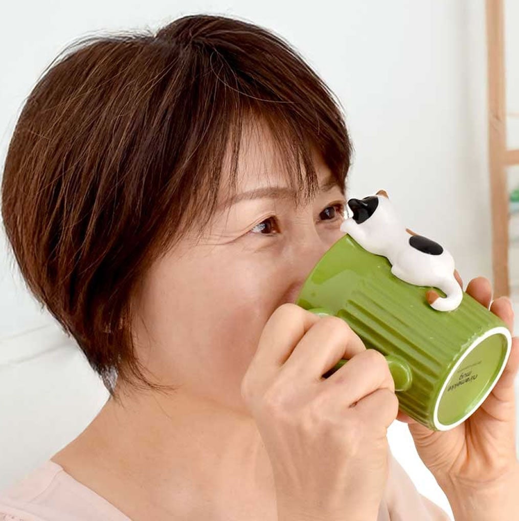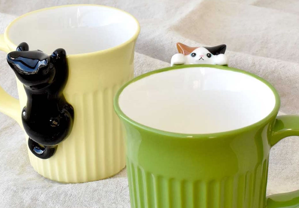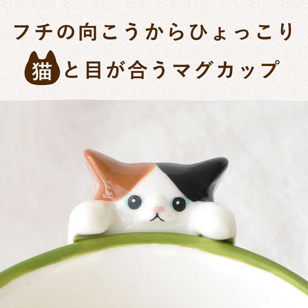 カップのフチからひょっこり顔を出す猫と、飲むたびに目が合うデザイン。いつものティータイムが至福のひとときに変わります。