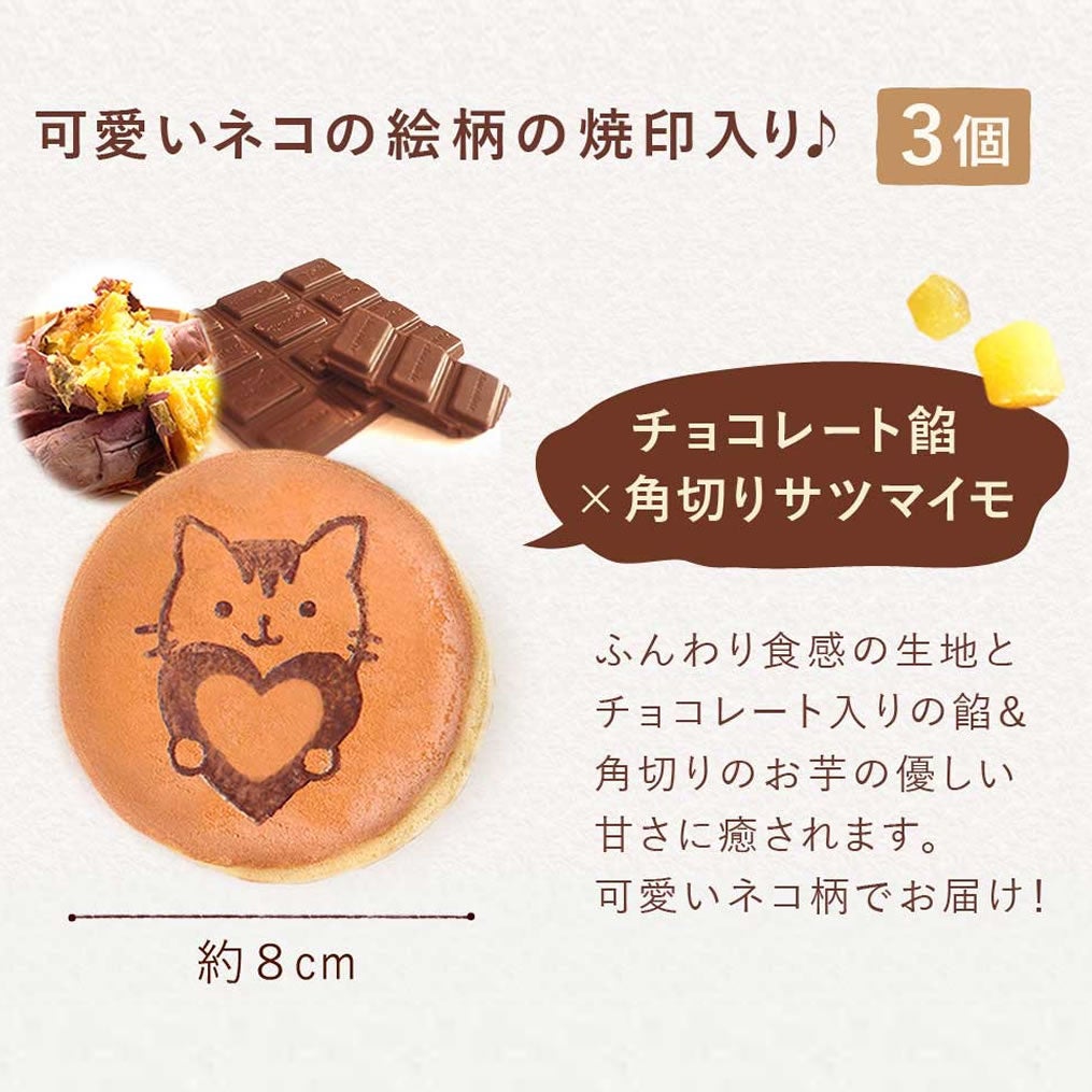 ハートをぎゅっと抱きしめた猫のオリジナル焼き印が愛らしいお芋チョコどら焼き付き。