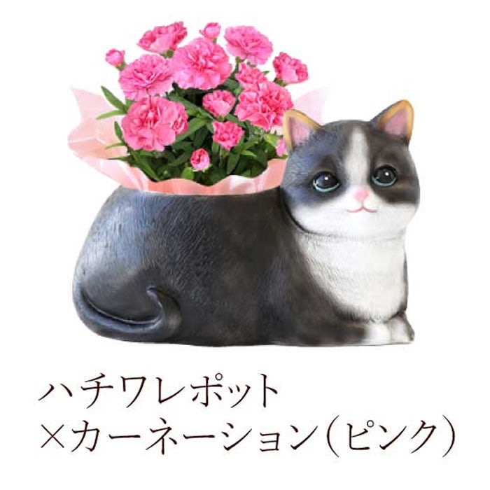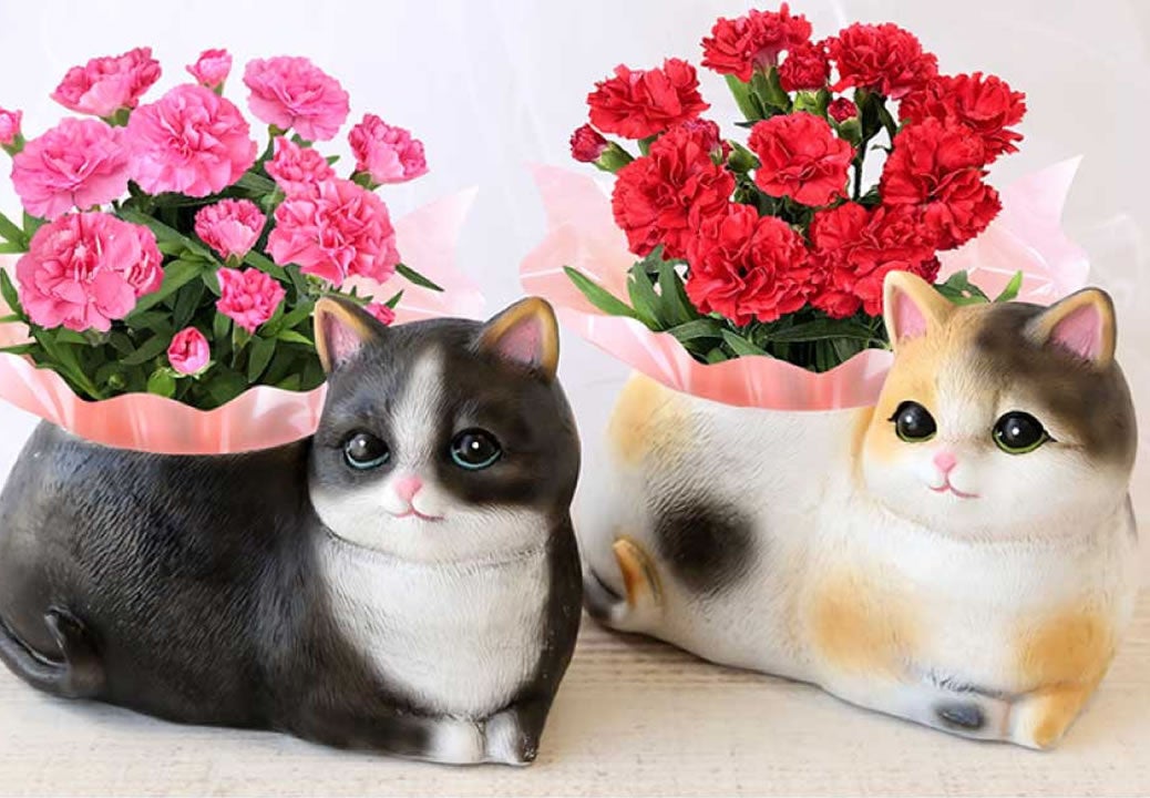 つぶらな瞳で見つめてくるリアルで愛らしい「三毛猫ポット」と「ハチワレポット」。背中部分には、鮮やかな赤やピンクのカーネーションがあしらわれており、お部屋をパッと明るくしてくれます。