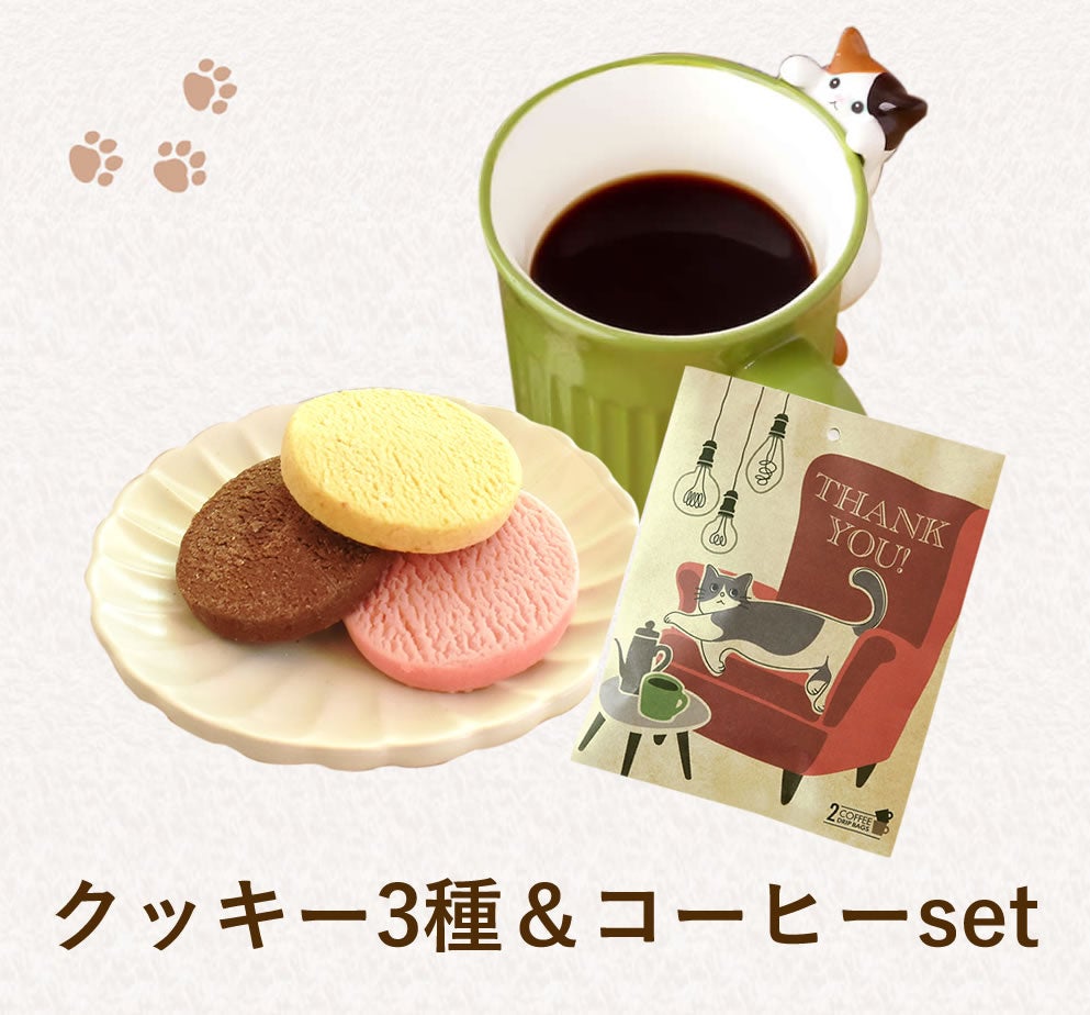 猫マグカップだけでなく、3種のクッキーとドリップコーヒーがセットに!