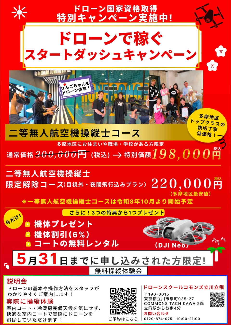 立川市に拠点を構える「ドローンスクールコモンズ立川立飛校」(運営:株式会社エーアールエー/代表取締役 新井正徳)は、テレビ出演を契機に注目が高まる中、2026年5月限定で「ドローンで稼ぐスタートダッシュキャンペーン」を実施いたします。