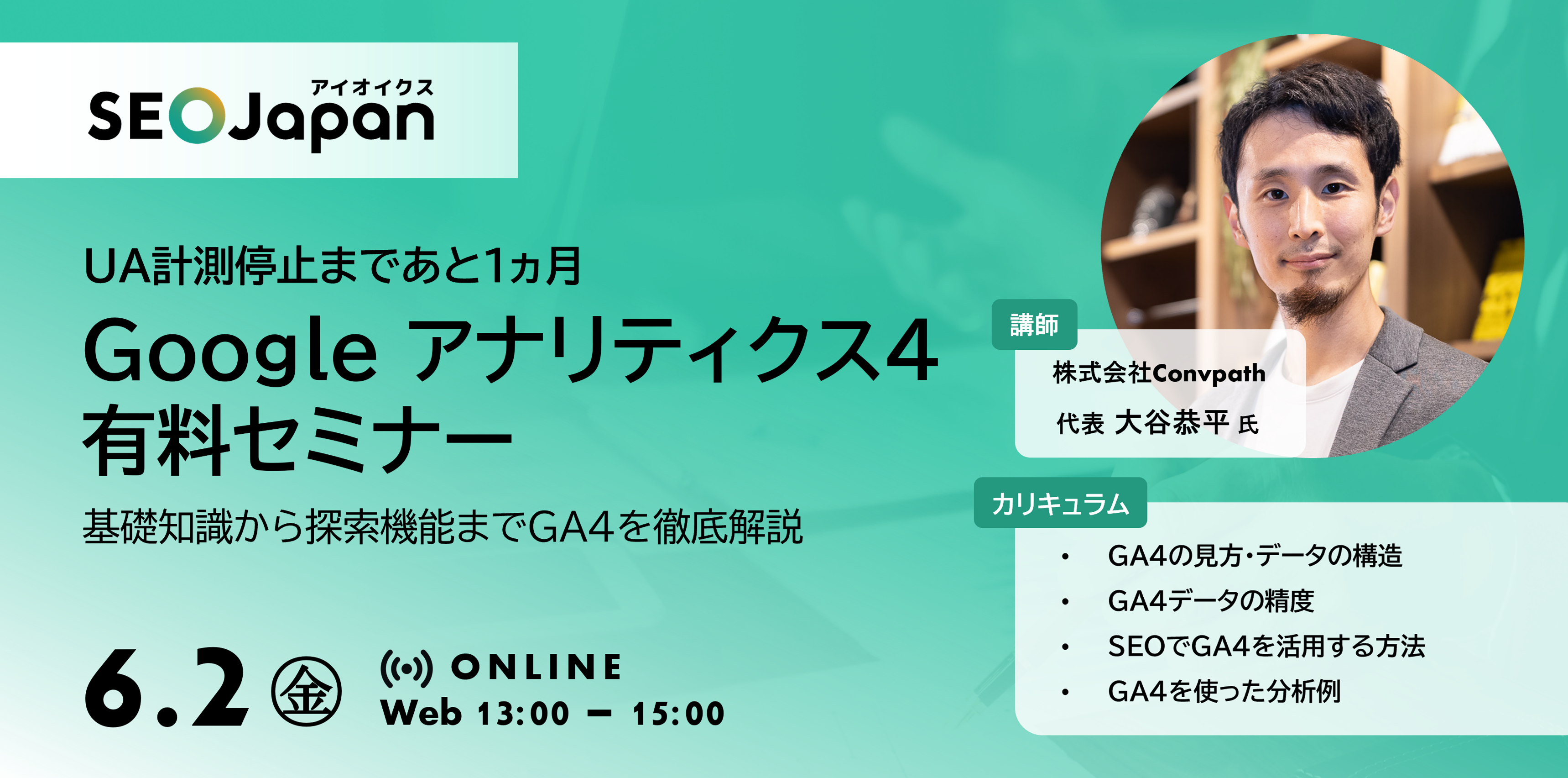 UA計測停止まであと1ヵ月!SEO Japan@アイオイクスが【まだ間に合う!GA4有料セミナー】を開催
