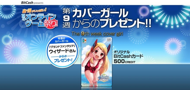 7月1日から9月1日までの期間で9回にわたり、『夏のオンラインゲーム祭り!!』を応援するカバーガールが登場し、そのカバーガールをモチーフとしたオリジナルBitCashカードを抽選で各回毎に100名様へプレゼントされます。