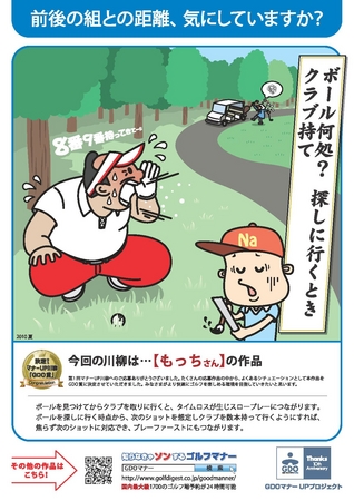7月1日より実施の第3弾ポスターでは、ゴルファー自らが考えたマナーを発信できる場を提供すべく、第2弾(2010/4/1~30)で募集したゴルフに関する「マナーUP川柳」の、最優秀作品にイラストを添えてポスターといたしました。