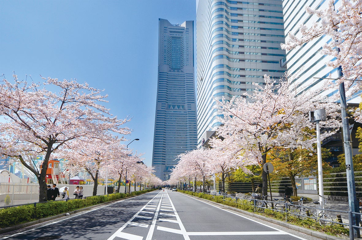 さくら通り:ランドマークタワーを背景に約500mの桜並木