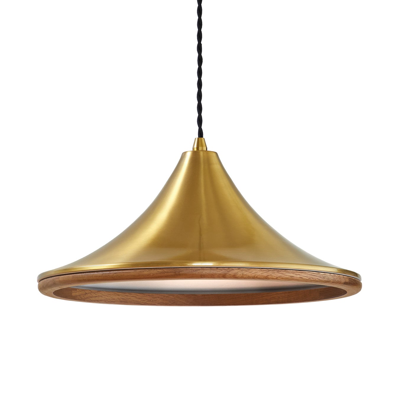 真鍮色とウッドを組み合わせたペンダントライト。商品名の「ANOD」は“Antique Wood Color”をもとにした造語で、ウッドの部分には、素材感のあるオーク無垢集成材を使用しています。