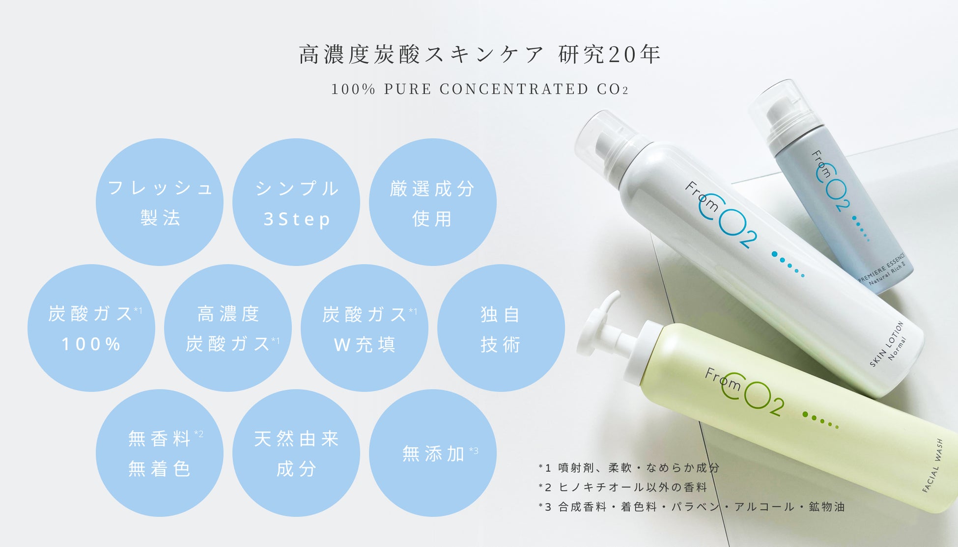 発売から24年目を迎えるfromCO2炭酸スキンケアは、長年の研究成果と独自技術により、肌の健康までをも見つめた商品作りをしています。肌の表面だけを整えるものではありません。天然由来成分にこだわり「シンプル処方」を徹底し余計な成分をできるだけ配合しない。女性でも、男性でも。どんな肌タイプでも。肌の調子が気になるときも。誰でも、いつでも、頼れる化粧品でありたい。それがfromCO2の願いです。