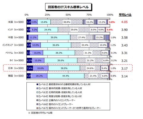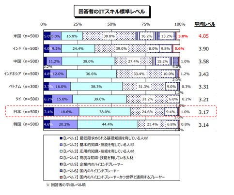 IT需要が急速に高まる日本において、人材不足に加え、ITエンジニアのスキルレベルや報酬の低さが深刻な課題となっています。実際に調査結果でも他国と比べてITスキル標準レベルが低いことが明らかです。