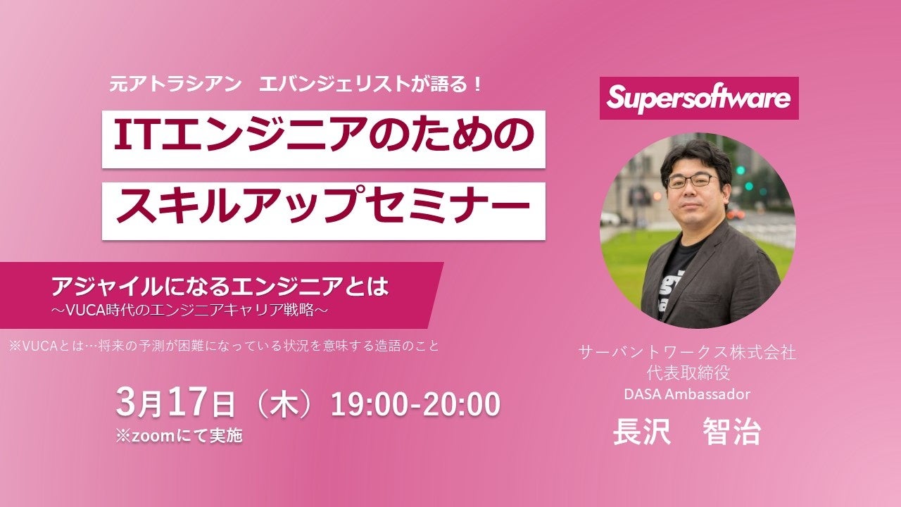 DXを推進するITパートナーとしてコンサルティングから開発まで一貫して行う株式会社スーパーソフトウエア 東京オフィス(所在地:東京都渋谷区、東京オフィス代表:船木俊介、以下当社)は、スキルやキャリアに悩む全国各地のITエンジニアに等しく学びの場を提供するため、スキルアップセミナーを開催いたします。第一回目は、サーバントワークス株式会社の長沢氏に登壇していただき「アジャイルになるエンジニアとは〜 VUCA*時代のエンジニアキャリア戦略~」をお話いただきます。