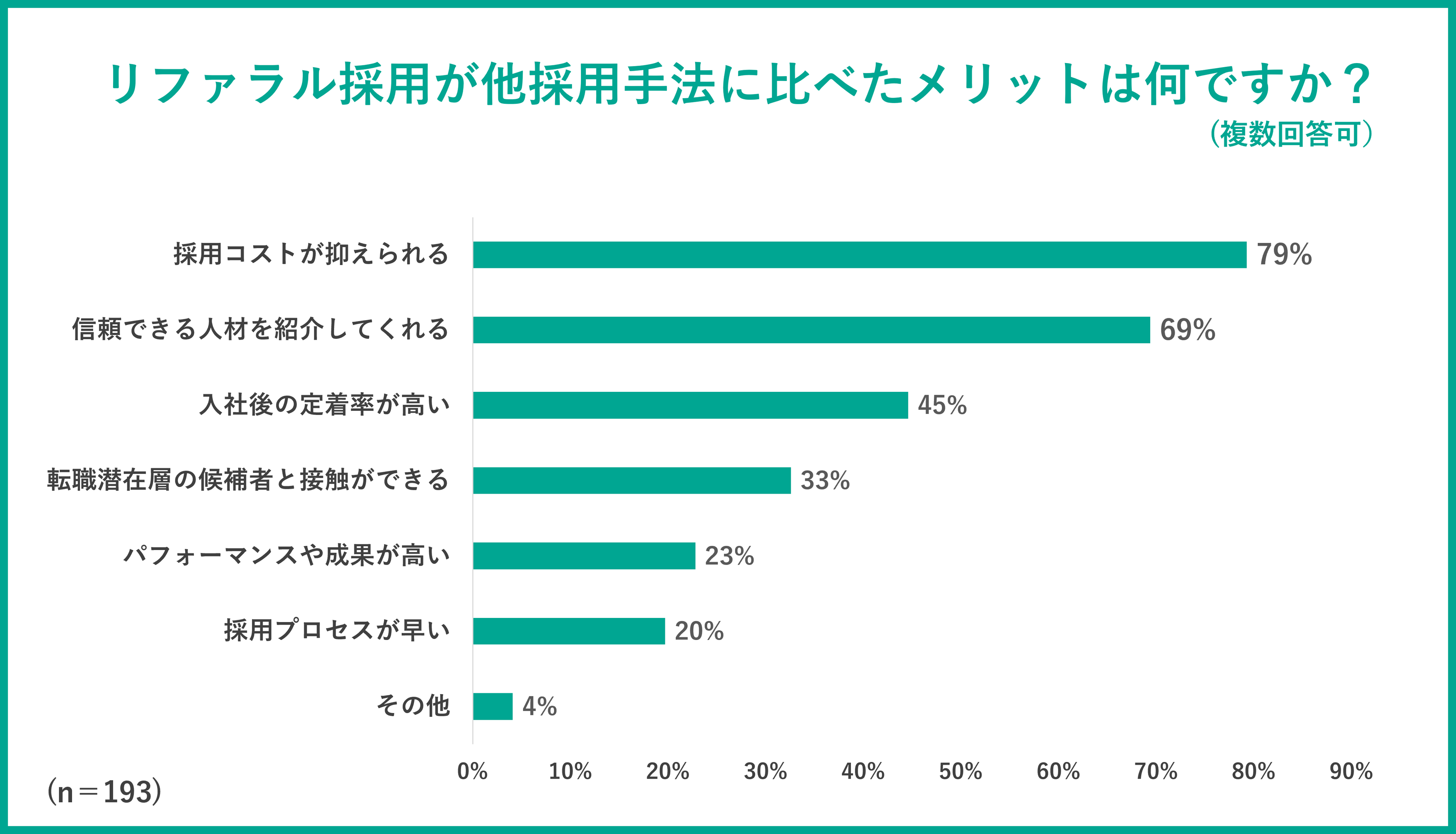 リファラル採用のメリットで、最も多かった回答は「採用コストが抑えられる」(79%)となりました。人材紹介の手数料や求人広告費等のコストが抑えられることが魅力の一つと考えられます。