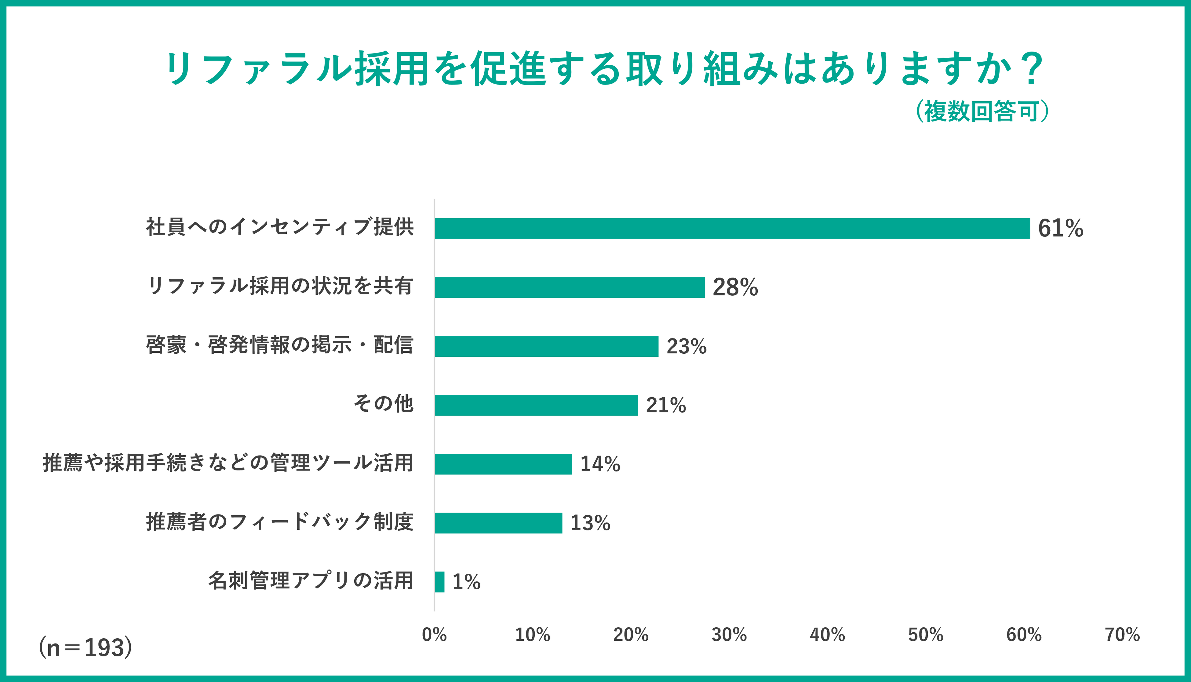 リファラル採用促進の取り組みとしては、「社員へのインセンティブ」(61%)が最も多く、次いで「リファラル採用の状況を共有」(28%)、「啓蒙・啓発情報の提示・配信」(23%)と続きました。社内への周知徹底や紹介者となる社員のモチベーション向上に重点を置いていることが伺えます。