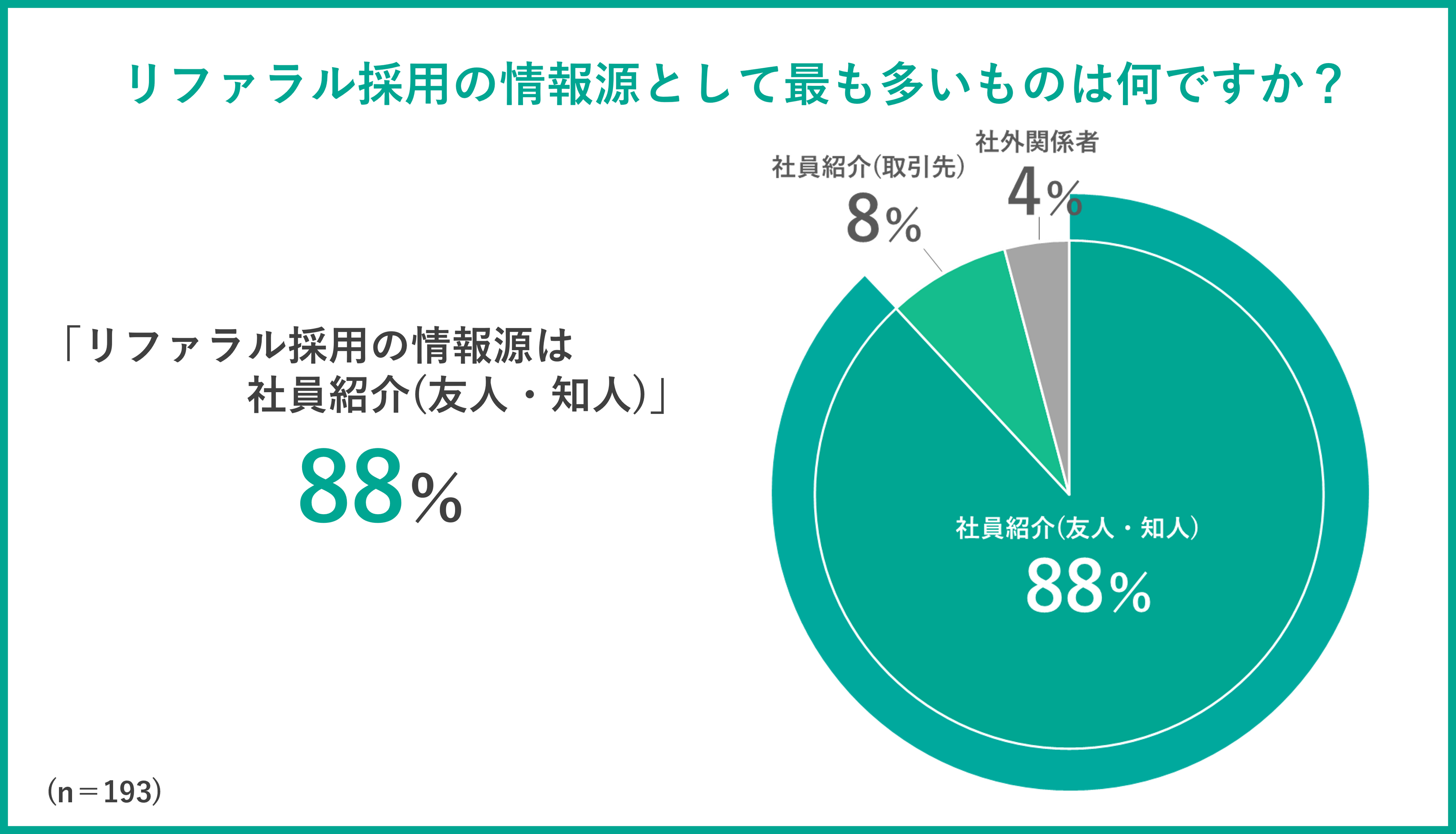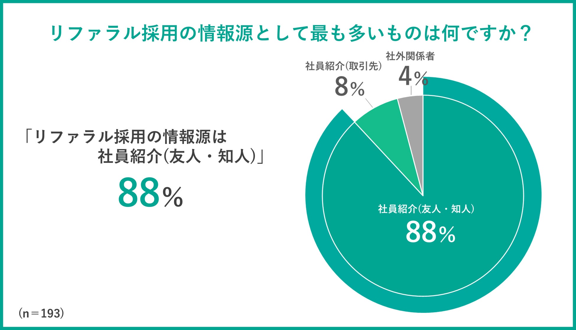 リファラル採用を実施したことがあると回答した企業が75%と、多くの企業が実践しており、リファラル採用の情報源は、社員による友人や知人紹介が88%と、圧倒的多数を占めました。