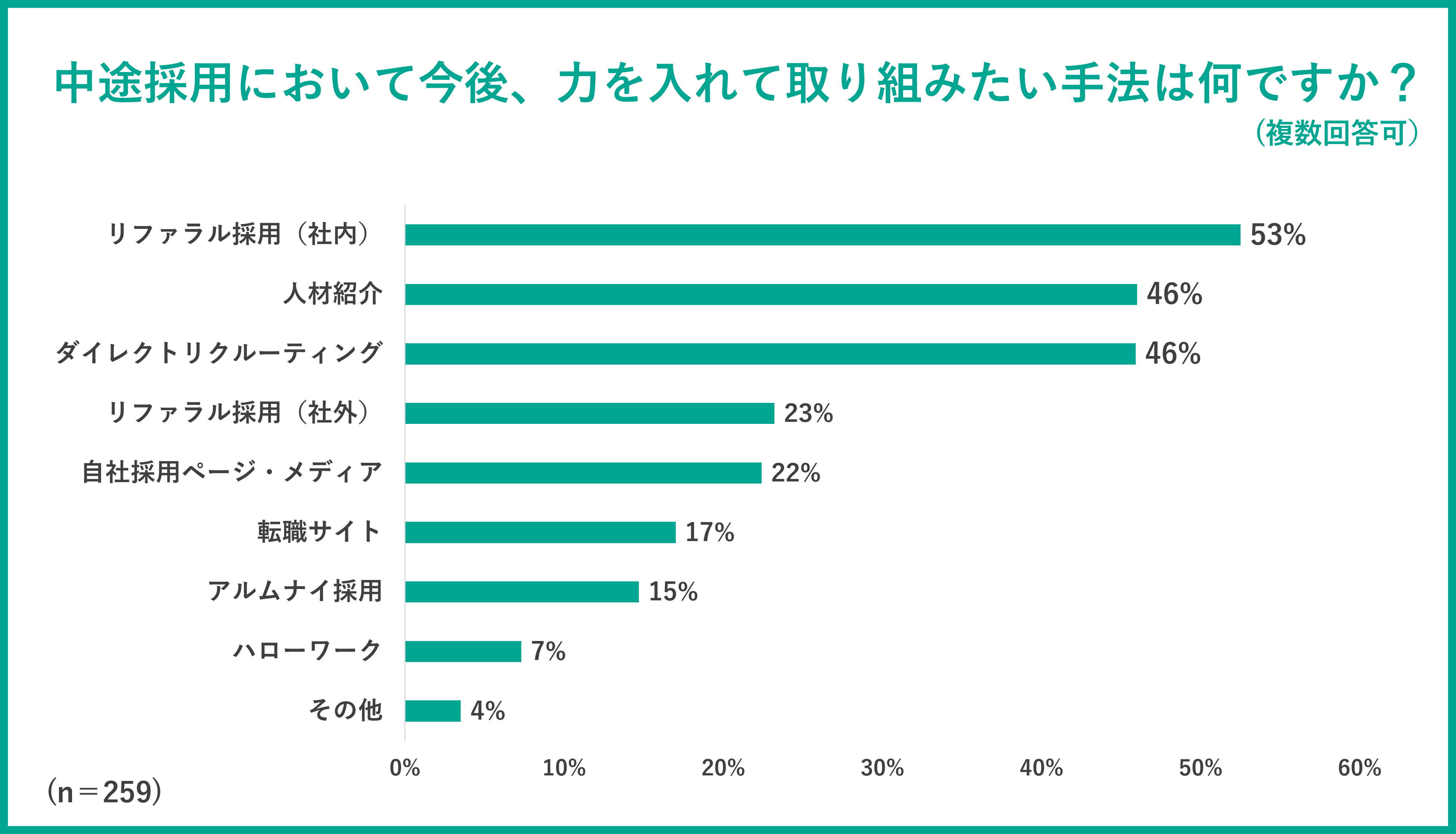 中途採用において今後、力を入れて取り組みたい採用手法について質問したところ、「リファラル採用(社内)」(53%)と「リファラル採用(社外)」(23%)を合わせて76%となり、今後の採用を担う有効な手法として注目されていることが分かります。